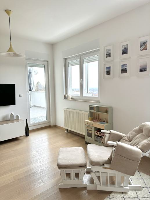 Stan se sastoji od ulaznog dijela, sobe koja je pretvorena u garderobnu, dvije spavaće sobe, kupaonice s walk in tušem, open space prostora (kuhinja, blagavaona i boravak) s izlaskom na veliku terasu orjentiranu na jugo-zapad s panoramskim pogledom na grad. U sklopu stana je i sjeverni zatvoreni balkon.