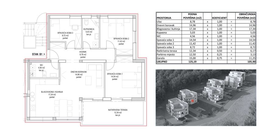Stan se nalazi na visokom prizemlju urbane vile ( oznake B 1 ) ukupne podne površine 125 m2 odnosno prodajne površine 106 m2 a sastoji se od ulaznog dijela, dvije kupaonice, kuhinje i blagavaonice, tri spavaće sobe od kojih jedna ima izlaz na terasu te dnevnog boravka koji ima izlaz na terasu . Stanu pripada jedan vanjski nenatkriveni parking.