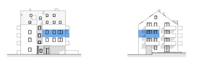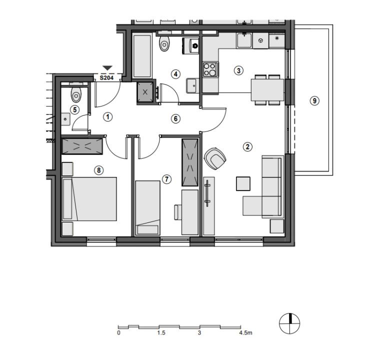 Trosoban stan na drugom katu, orijentacije na jug i istok. Sastoji se od ulaznog prostora, kuhinje, dnevnog boravka, hodnika, dvije spavaće sobe, kupaonice, wc-a i balkona. Stvarna površina s otvorenim i zatvorenim prostorima iznosi 61.09 m2.