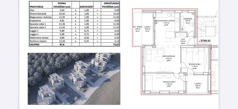 Ukupne podne površine 88 m2 odnosno prodajne površine 73 m2 a sastoji se od ulaznog dijela, kupaonice, kuhinje i blagavaonice, dvije spavaće sobe koje imaju izlaz na zajedničku loggie te dnevnog boravka koji ima izlaz na zapadnu terasu . Stanu pripada jedan vanjski nenatkriveni parking . Vrt površine cirka 180 m2 i garaža se mogu kupiti.