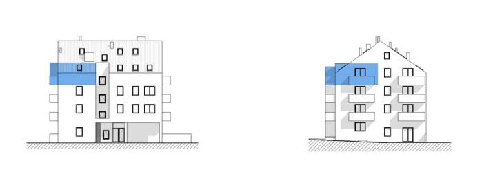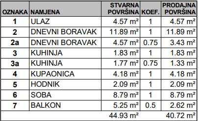 Dvosoban stan u potkrovlju, orijentacije na jug i zapad. Sastoji se od ulaznog prostora, dnevnog boravka, kuhinje, spavaće sobe, hodnika, kupaonice i balkona. Stvarna površina s otvorenim i zatvorenim prostorima iznosi 44.93 m2.