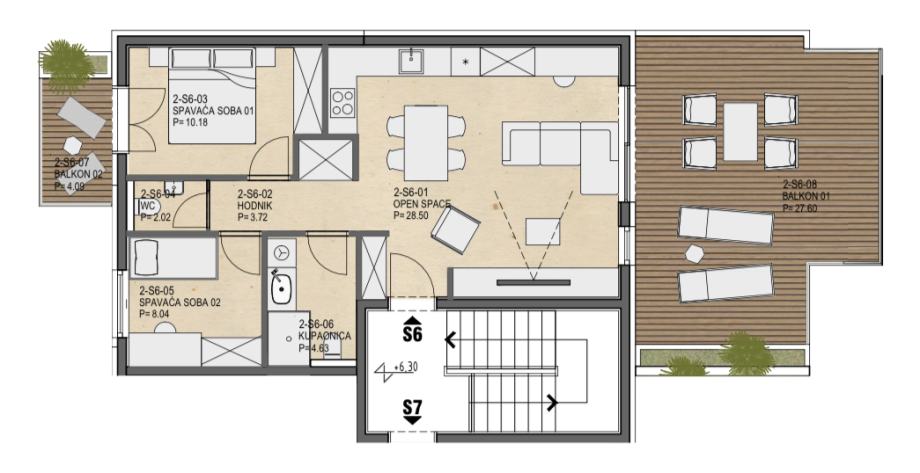 3-sobni stan Z5-S6 (57,09m2) prostire se na etaži 2. kata. Sastoji se od kuhinje, blagavaonice, dnevnog boravka, gostinjskog wc-a, kupatila, hodnika te dvije sobe u spavaćem djelu. Iz dnevnog boravaka se izlazi na prostranu terasu (27,60m2), dok bračna soba ima izlaz na natkriveni balkon (4,09m2). Stanu pripada spremište u podrumu (8,00m2) kao i jedno parkirno mjesto (12,50m2) u dvorištu zgrade. Stan odlikuje najviši stupanj opreme (dizalica topline (podno grijanje), klima uređaj, videoportafon, elektropunjač za automobile,...) i najsuvremenije tehnologije u pogledu instalacija i upravljanja istima , dok energetska učinkovitost zadovoljava najviše standarde (enrgetski razred A+).