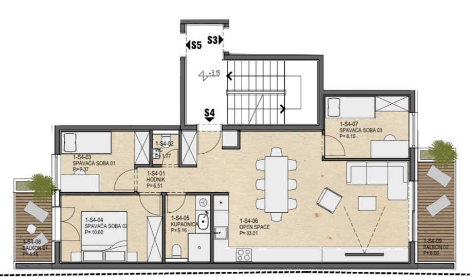 4-sobni stan Z4-S4 (72,57m2) prostire se na etaži 1. kata. Sastoji se od: kuhinje, blagavaonice, dnevnog boravka, spavaće sobe u sklopu dnevnog boravka, gostinjskog wc-a, kupatila, hodnika te još dvije sobe u spavaćem djelu. Iz dnevnog boravaka se izlazi na natkriveni balkon (6,00m2). Bračna soba također ima izlaz se na natkriveni balkon (4,16m2). Stanu pripada spremište u podrumu (10,33m2) kao i jedno parkirno mjesto (12,50m2) u dvorištu zgrade. Stan odlikuje najviši stupanj opreme (dizalica topline (podno grijanje), klima uređaj, videoportafon, elektropunjač za automobile,...) i najsuvremenije tehnologije u pogledu instalacija i upravljanja istima , dok energetska učinkovitost zadovoljava najviše standarde (enrgetski razred A+).