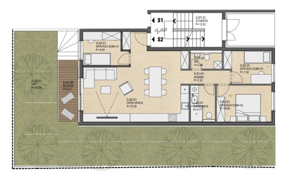 4-sobni stan Z5-S2 (74,92m2) prostire se na etaži visokog prizemlja. Sastoji se od kuhinje, blagavaonice, dnevnog boravka, spavaće sobe u sklopu dnevnog boravka, gostinjskog wc-a, kupatila, hodnika te još dvije sobe u spavaćem djelu. Iz dnevnog boravaka izlazi se na natkrivenI balkon (6,71m2) sa kojeg se pristupa u vrt (95,45m2) koji također pripada stanu. Izvedba sobe u sklopu dnevnog boravka je opcija, te se prilikom gradnje ne mora izvesti (želja kupca). U tom slučaju dnevni boravak se uvećava za površinu iste. Stanu pripada spremište u podrumu (11,14m2) kao i jedno parkirno mjesto (12,50m2) u dvorištu zgrade. Stan odlikuje najviši stupanj opreme (dizalica topline (podno grijanje), klima uređaj, videoportafon, elektropunjač za automobile,...) i najsuvremenije tehnologije u pogledu instalacija i upravljanja istima, dok energetska učinkovitost zadovoljava najviše standarde (enrgetski razred A+).
