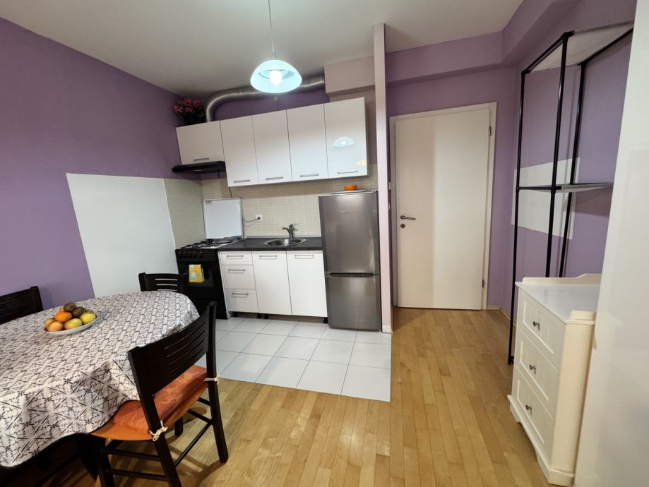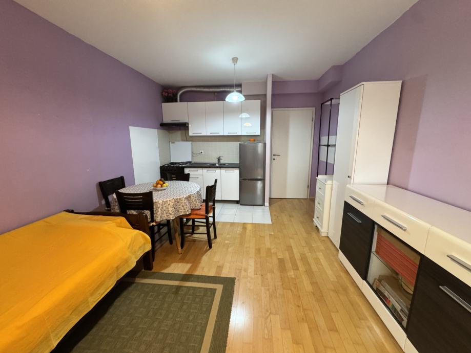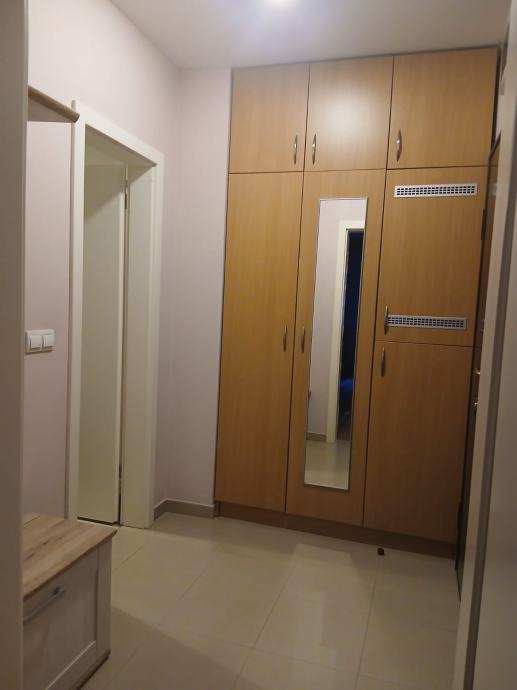 Stan se sastoji od ulaznog prostora u kojem se nalazi ugradbeni ormar, ulaz u kupaonicu i ulaz u sobu s kuhinjom i blagovaonicom.
