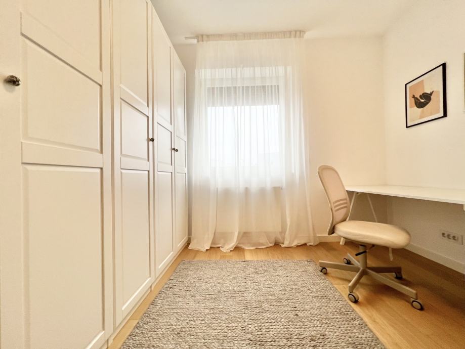 The apartment is oriented east and west with a view of the inner atrium, sunny and bright.
