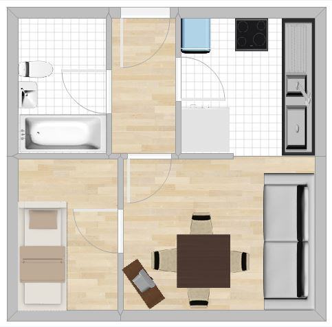 Ravnice, mali 1,5-sobni stan (1S+DB), površine 33m2. Sastoji se od ulaznog prostora, kuhinje, kupaonice s kadom i WC-om, dnevne sobe i manje spavaće sobe. Smješten na visokom prizemlju. Ima etažno plinsko grijanje, vlastito očitanje vodomjera.