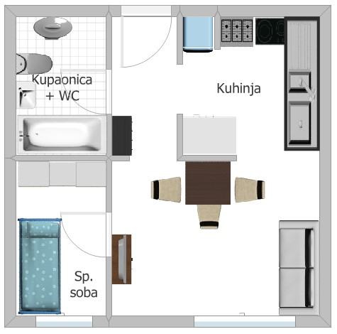 Ravnice, mali 1,5-sobni stan (1S+DB), površine 33m2. Sastoji se od ulaznog prostora, kuhinje, kupaonice s kadom i WC-om, dnevne sobe i manje spavaće sobe. Smješten na visokom prizemlju. Ima etažno plinsko grijanje/toplu vodu, vlastito očitanje vodomjera, hladnjak s ledenicom, plinsko-električni štednjak.