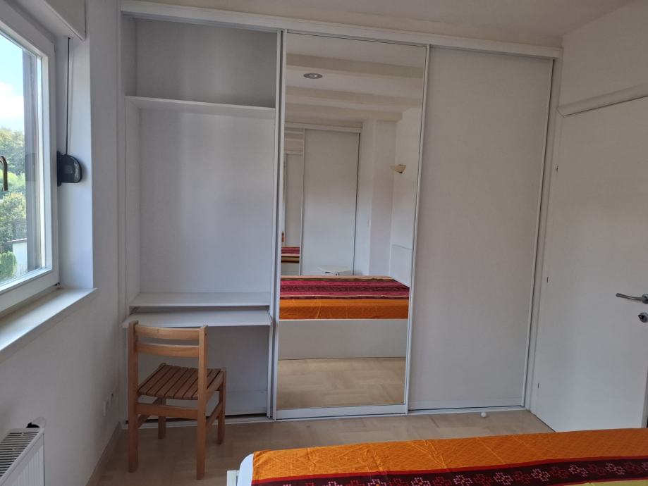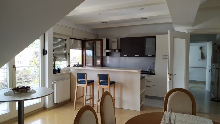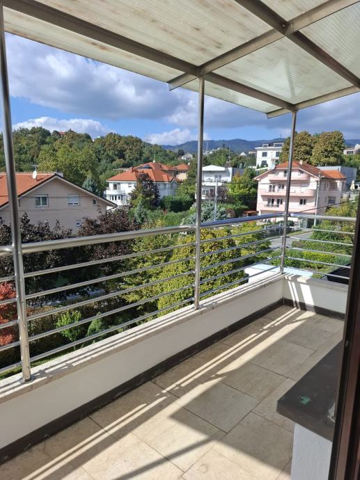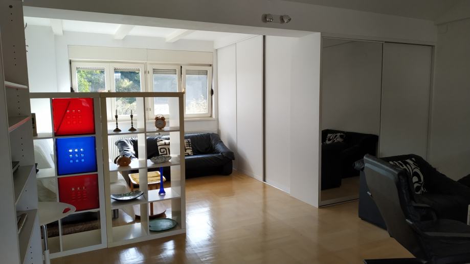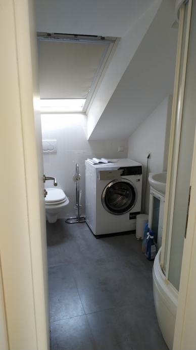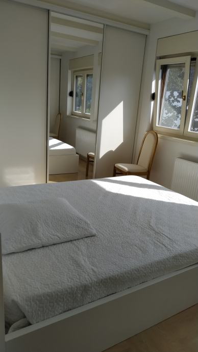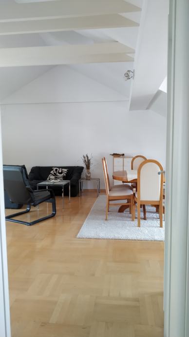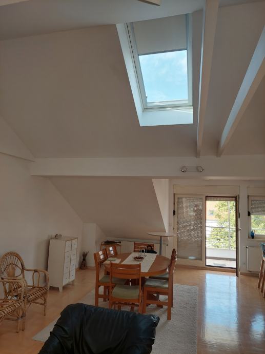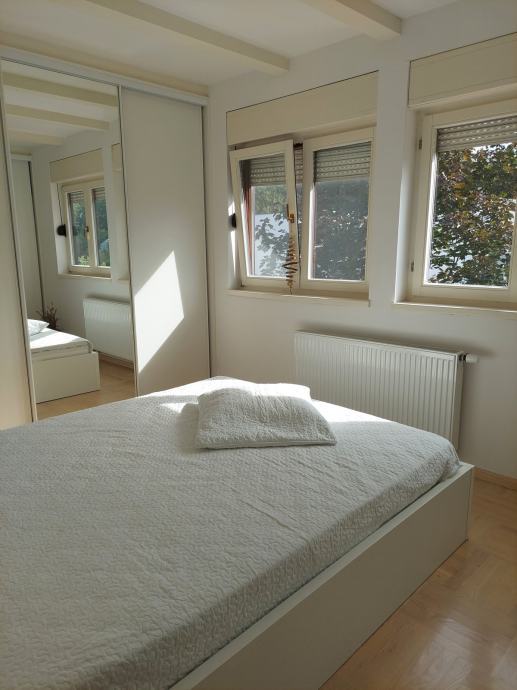 Iznajmljuje se prekrasni moderni 2-sobni stan u Remetama. Stan se nalazi u potkrovlju obiteljske kuće, a sastoji se od: hodnika, funkcionalnog i modernog dnevnog boravka s kaučem na razvlačenje u sklopu blagovaonice i kuhinje. 1 spavaće sobe s pogledom na zelenilo prema jugu, sa 2 ugradbena ormara. U sobi se nalazi izlaz za spremište u potkrovlju. U dnevnom boravku se nalaze ugradbeni ormari koji tvore malu prostoriju, a može poslužiti kao sobica za 1 osobu, radna soba ili dodatno spremište. Stan ima 1 kupaonicu s tuš kabinom, dok druga kupaonica ima zatvorenu kadu. Kroz kuhinju se izlazi na prostrani balkon s pogledom na šumu.