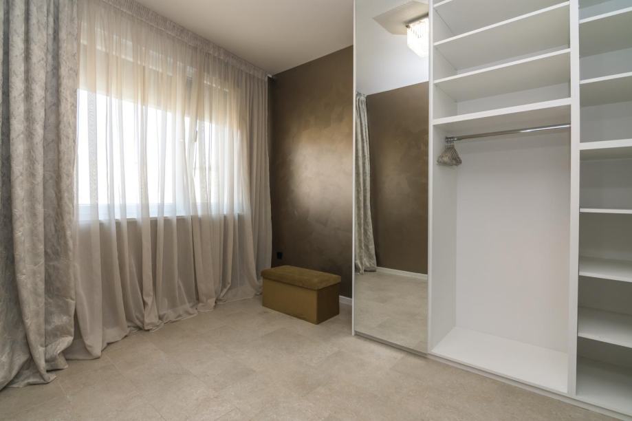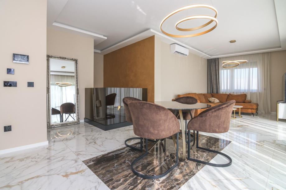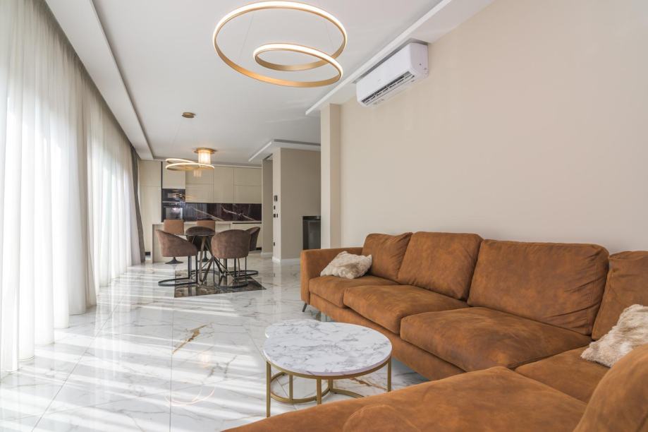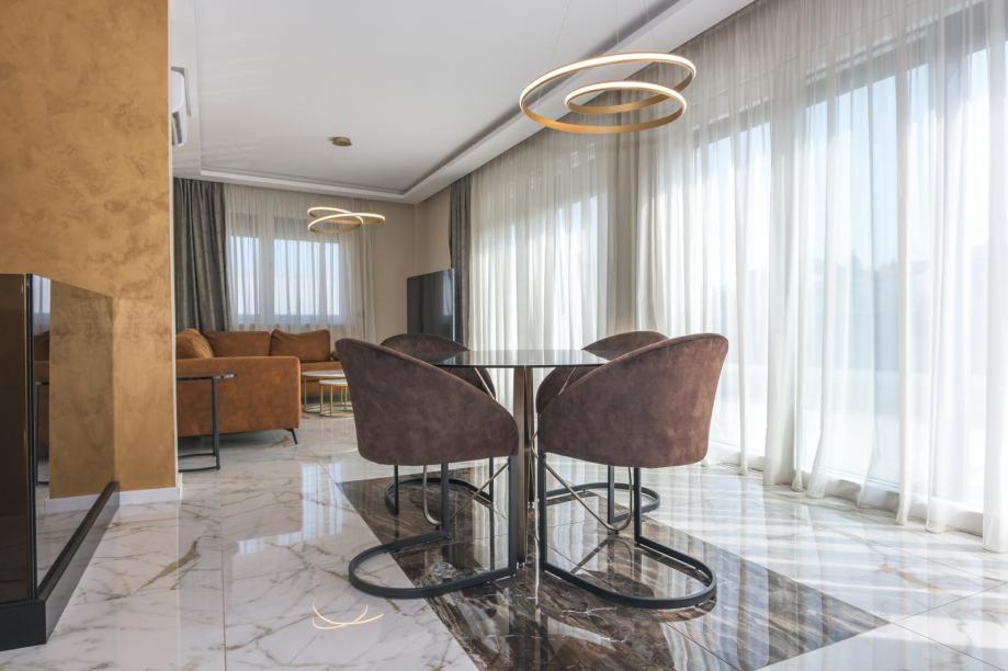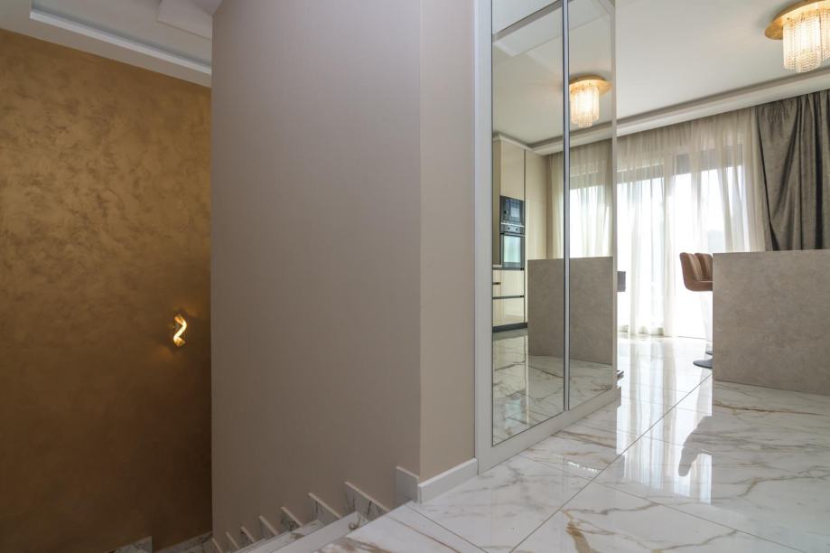 - Stan se sastoji od 3 spavaće sobe ( jedna s vlastitom kupaonicom i walk in garderobom ), 2 kupaonice , stubište ulazi se na 1. katu i ide na 2 kat gdje je stan) - galerija, prostran dnevni boravak s ogromnom terasom, kuhinja sa svim kućanskim aparatima, smart - home sustav, video portafon, električni sistem roleta, korišteni luksuzni materijali vrhunske kvalitete u opremanju, stolarija, mramor, kaljeno staklo, parket troslojni ( podno grijanje), najmodernija tehnika ručnog oslikavanja zidova +podovi epoxy ( unutarnje uređenje u San Marco Luxury dekorativnim tehnikama, s efektom saharskog pijeska, HD Surface ekološka zidna dekoracija, te San Marco Monolit zidne plohe kupaonice bez fuga), indirektna luksuzna rasvjeta, prvoklasna keramika Villeroy&Boch, protuprovalna vrata.