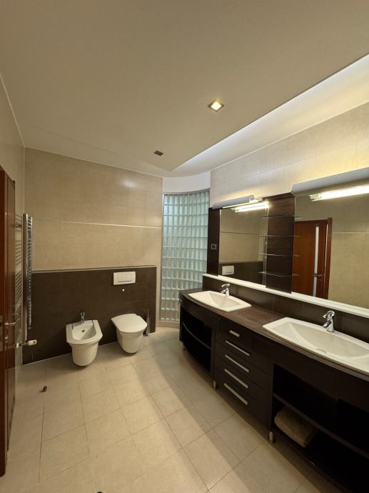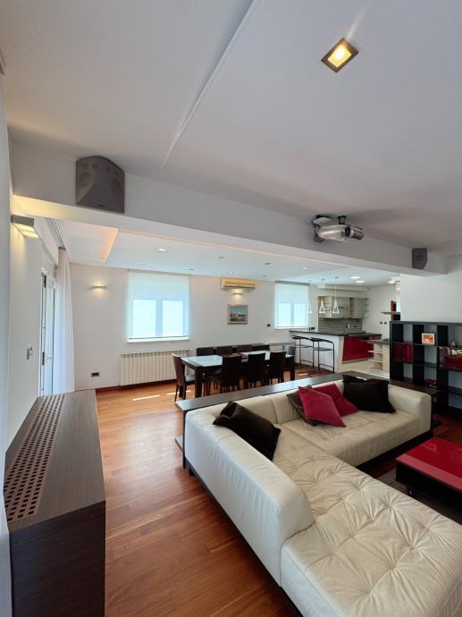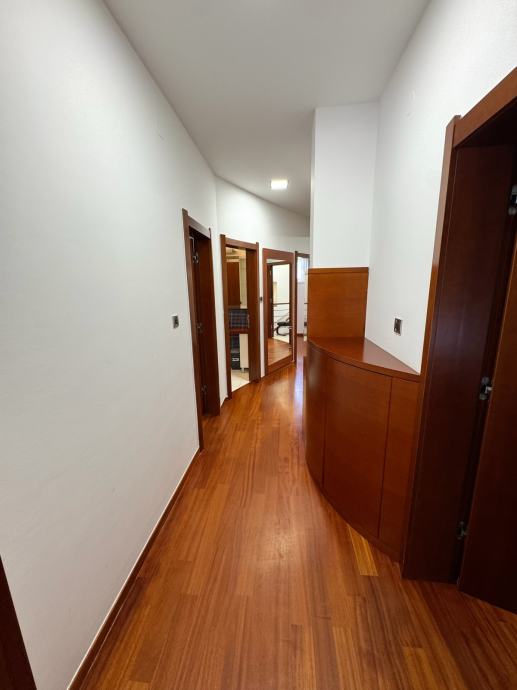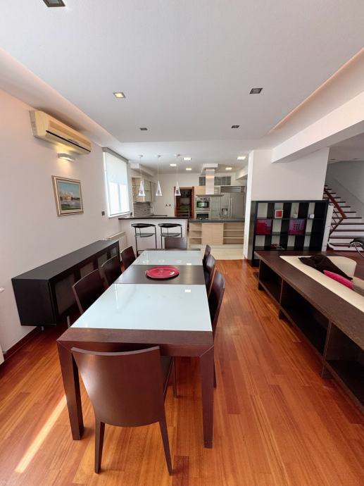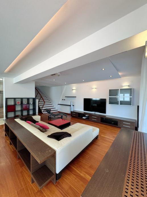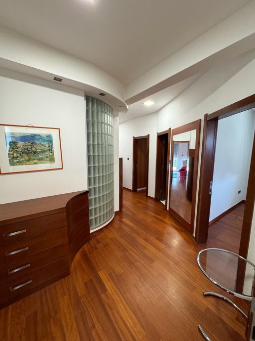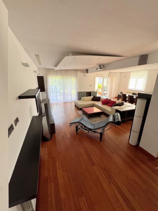 Stan je izuzetno prostran, površine 172,24 m2, s terasom u prizemlju (17,26 m2), ulaznim podestom u prizemlju (4,65) m2 i terasom u suterenu (22,80 m2) te pripadajućim dijelom dvorišta površine 194,15 m2.