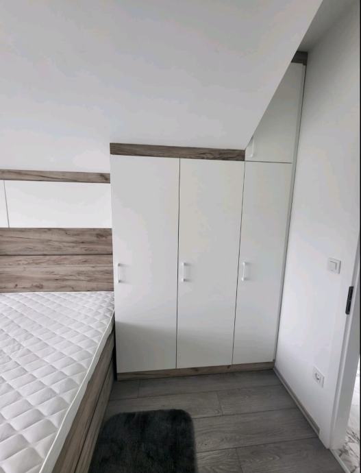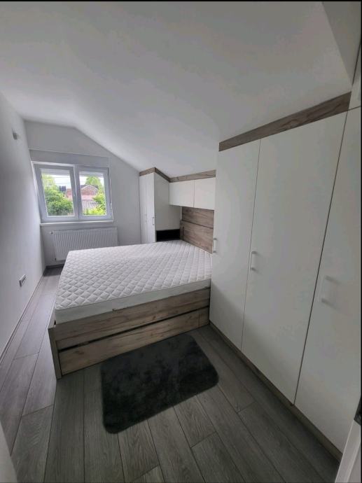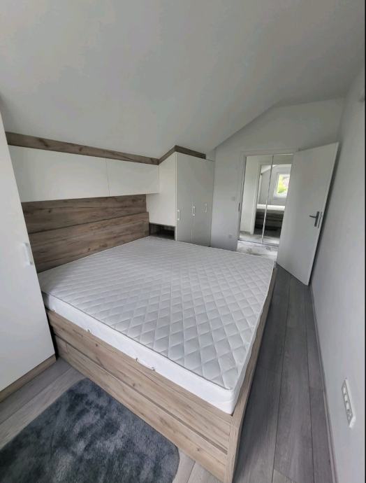 Na katu se nalaze dvije spavaće sobe. Glavna spavaća soba opremljena je bračnim krevetom dimenzija 2x2 m s ladicama i ugradbenim ormarom. Druga soba sadrži radni stol, ormar po mjeri i krevet na razvlačenje, pogodan za dodatni smještaj. Na katu se nalazi i kupaonica s walk-in tušem, kao i hodnik s ugradbenim ormarom koji omogućuje maksimalnu organizaciju prostora.