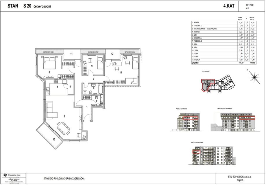 Četverosobni stan S20 nalazi se na 4. katu novogradnje na Zagrebačkoj cesti. Ukupna mu je površina 121,57 m2 (neto 115,53 m2).