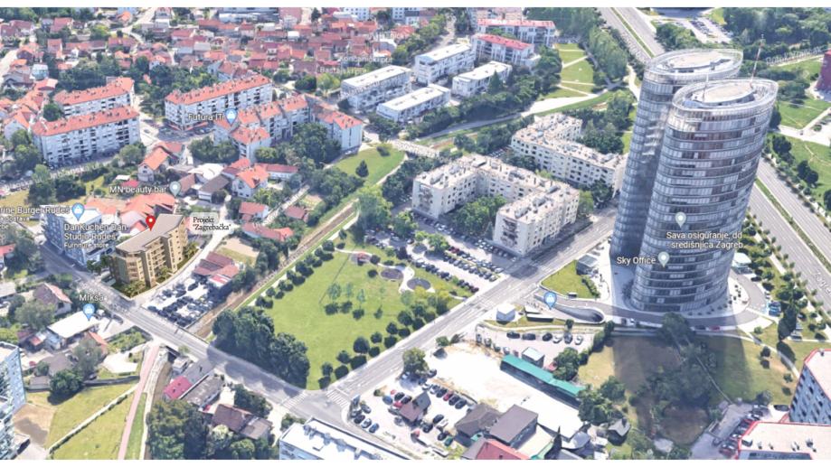Zgrada se nalazi na izuzetno atraktivnoj lokaciji. Zagrebačka cesta je glavna cesta (neposredna blizina Slavonske avenije) koja nudi odličnu prometnu povezanost. Autobusna linija Črnomerec-Prečko dodatno olakšava povezanost sa Ilicom i Horvaćanskom ulicom. U neposrednoj blizini objekta nalaze se svi životno bitni sadržaji. U krugu od 500 metara nalaze se trgovački lanci Kaufland, Lidl, Super Konzum, Konzum, shopping centri City Centar, Z centar (Cinestar) te King Cross. Također na 2-3 minute hoda nalaze se Sky Office, Pošta, restorani, kafići te dvije osnovne škole, dva dječja vrtića, parkovi za djecu te dom zdravlja i ljekarne.