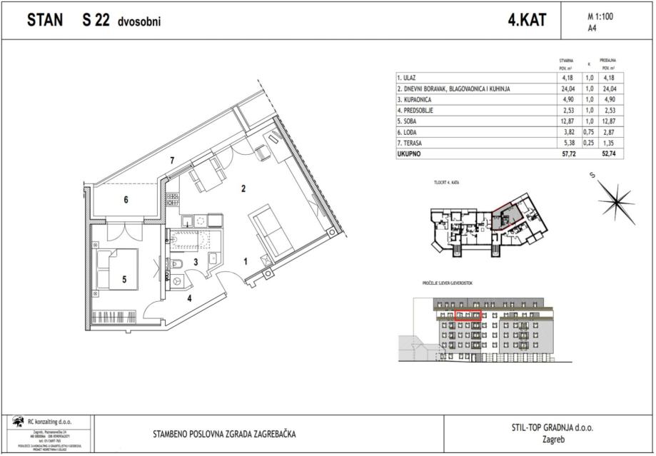 Dvosobni stan S22 nalazi se na 4. katu novogradnje na Zagrebačkoj cesti. Ukupna mu je površina 57.72 m2 (neto 52.74 m2).