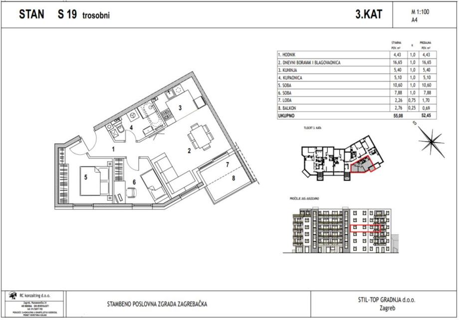 Trosobni stan S19 nalazi se na 3. katu novogradnje na Zagrebačkoj cesti. Ukupna mu je površina 55,08 m2 (neto 52,45 m2).