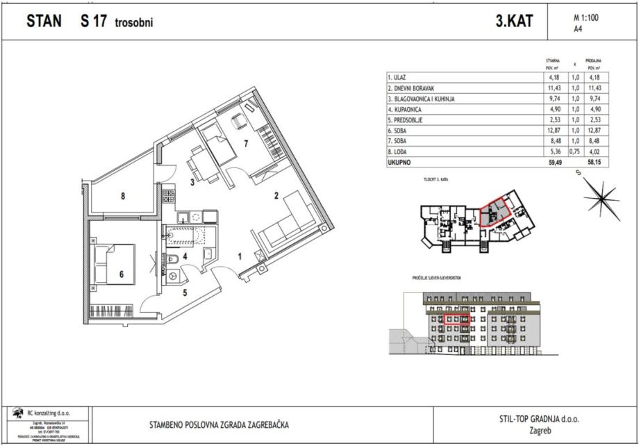 Trosobni stan S17 nalazi se na 3. katu novogradnje na Zagrebačkoj cesti. Ukupna mu je površina 59,49 m2 (neto 58,15 m2).