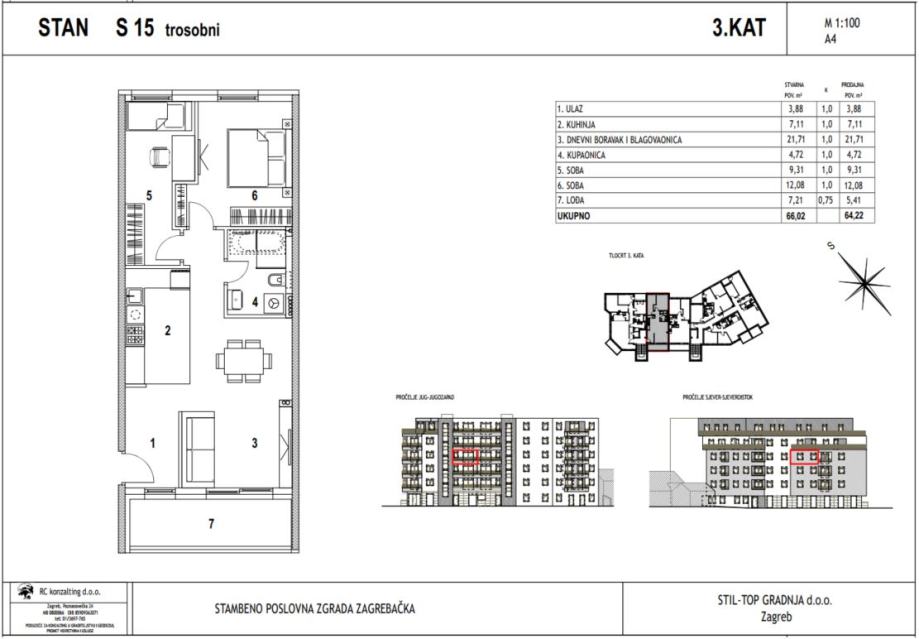 Trosobni stan S15 nalazi se na 3. katu novogradnje na Zagrebačkoj cesti. Ukupna mu je površina 66,02 m2 (neto 64,22 m2).