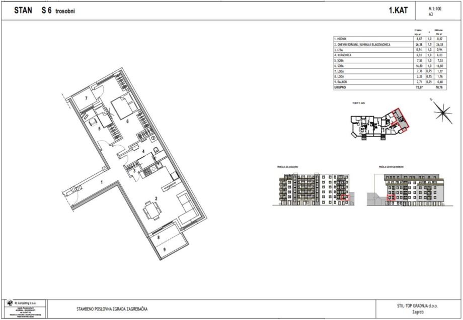 Trosobni stan S6 nalazi se na 1. katu novogradnje na Zagrebačkoj cesti. Ukupna mu je površina 73,97 m2 (neto 70,76 m2).