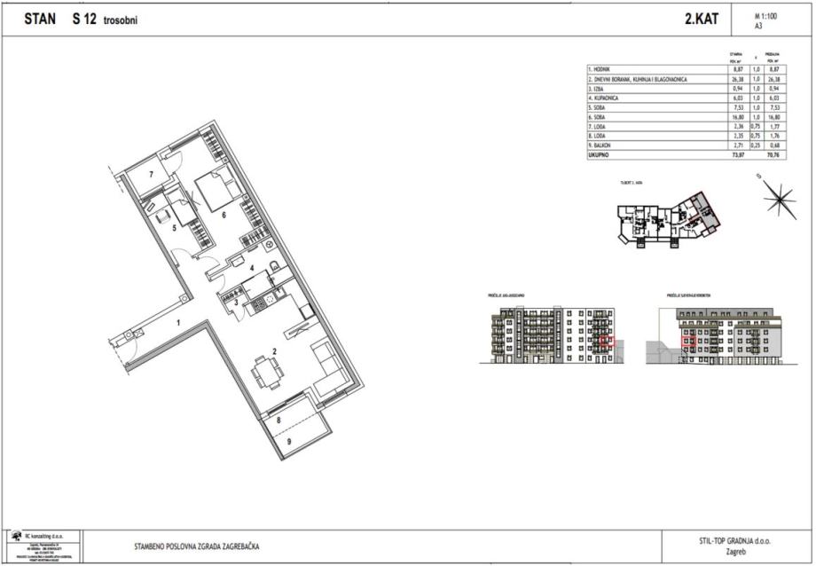 Trosobni stan S12 nalazi se na 2. katu novogradnje na Zagrebačkoj cesti. Ukupna mu je površina 73,97 m2 (neto 70,76 m2).