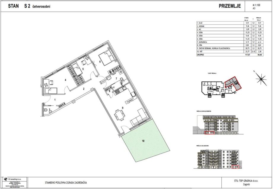 Četverosobni stan S2 nalazi se u prizemlju novogradnje na Zagrebačkoj cesti te posjeduje i vrt od 25,77 m2. Ukupna mu je površina 117,67 m2 (neto 94,48 m2).