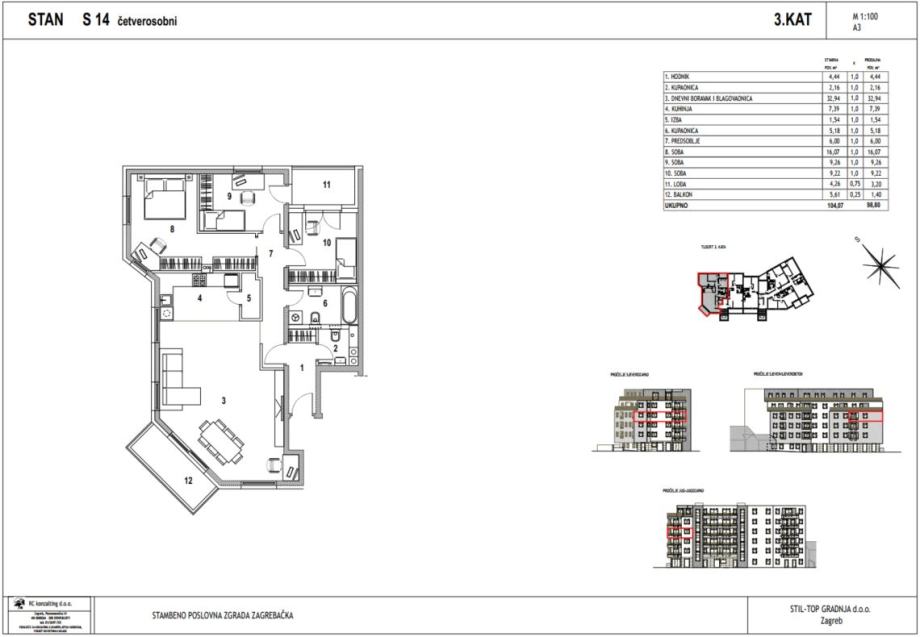 Četverosobni stan S14 nalazi se na 3. katu novogradnje na Zagrebačkoj cesti. Ukupna mu je površina 104,07 m2 (neto 98,80 m2).