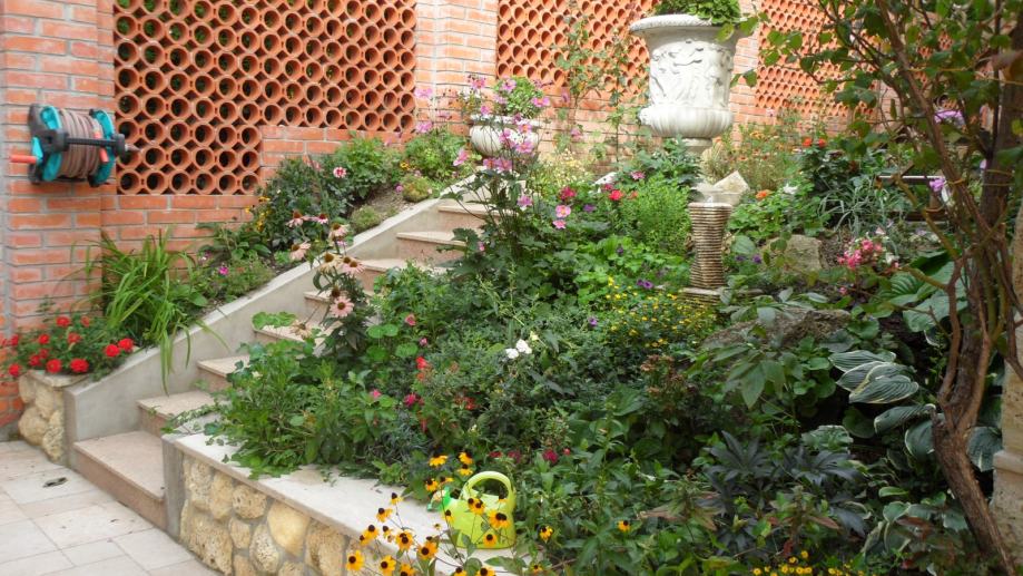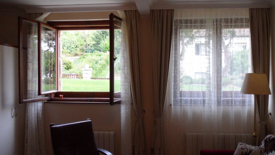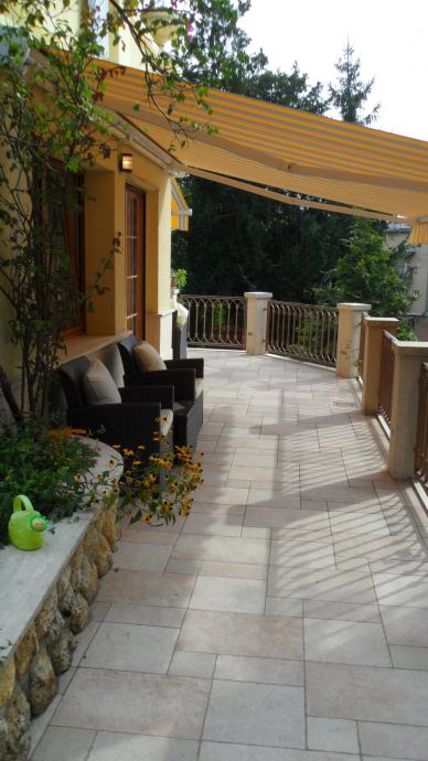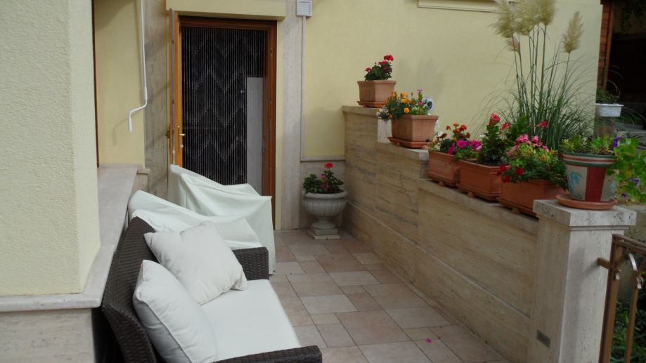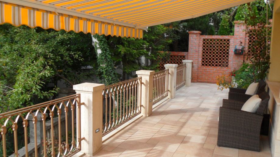 Terasa: ima tende sa senzorima za vjetar. Tende se mogu spustiti horizontalno i vertikalno tako da terasa može izgledati u ljeto kao jedna velika soba. Iz terase se spušta u vrt, sa strane se nalazi mali kamenjar sa fontanom.