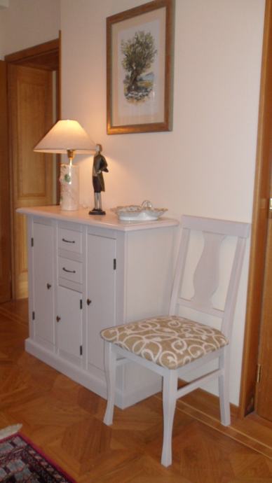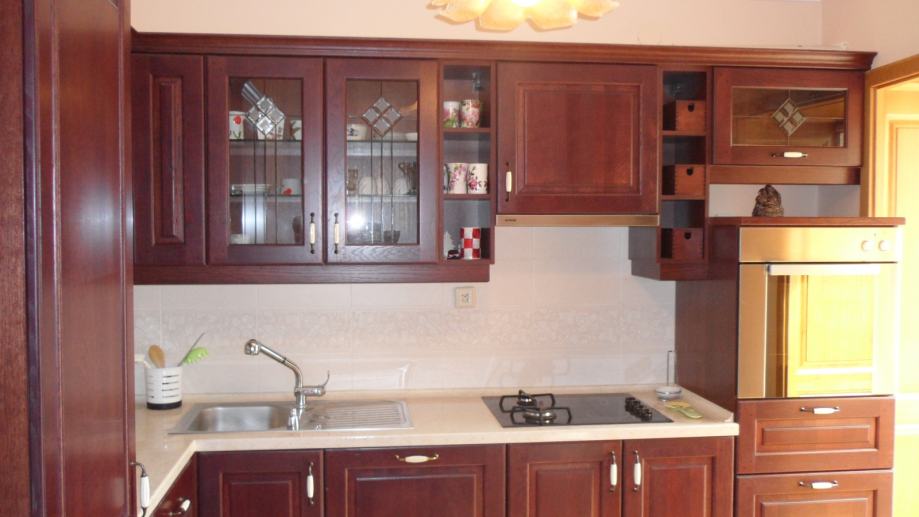 Kuhinja: opremljena kompletno: pećnica, grijača ploća, perilica suđa, hladnjak, napa, stol sa 4 stolice, u sklopu kuhinje je i mala ostava. Povezana je terasom, na koju se izlazi iz dnevne sobe.