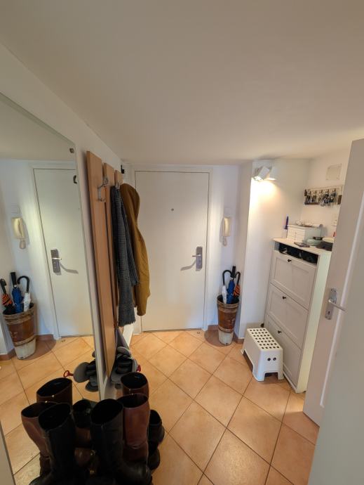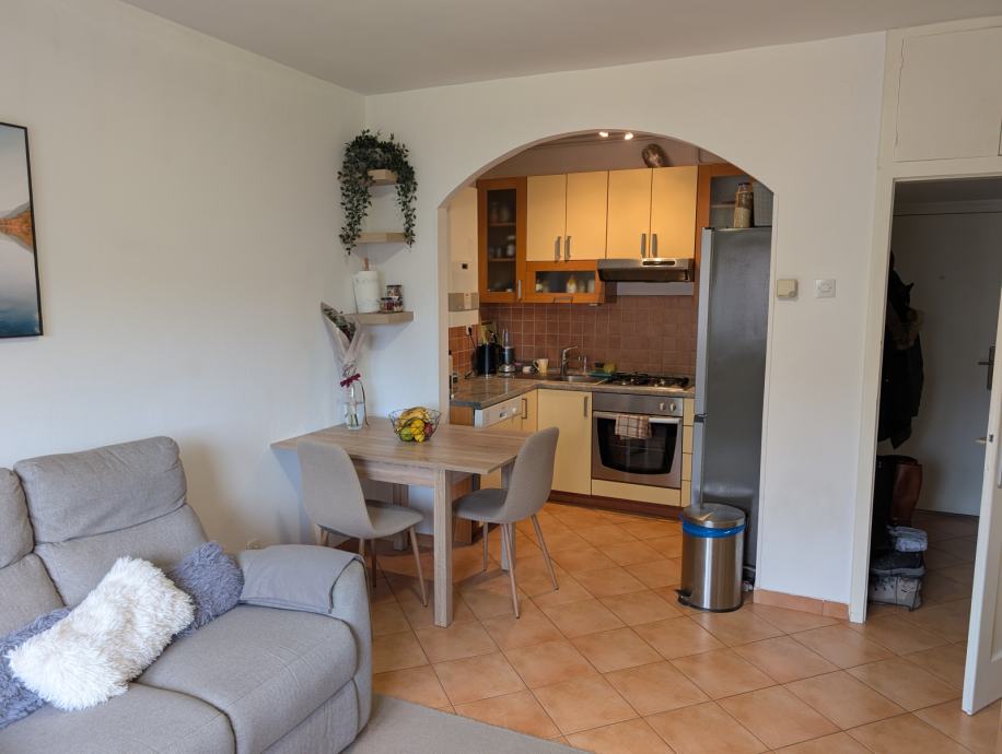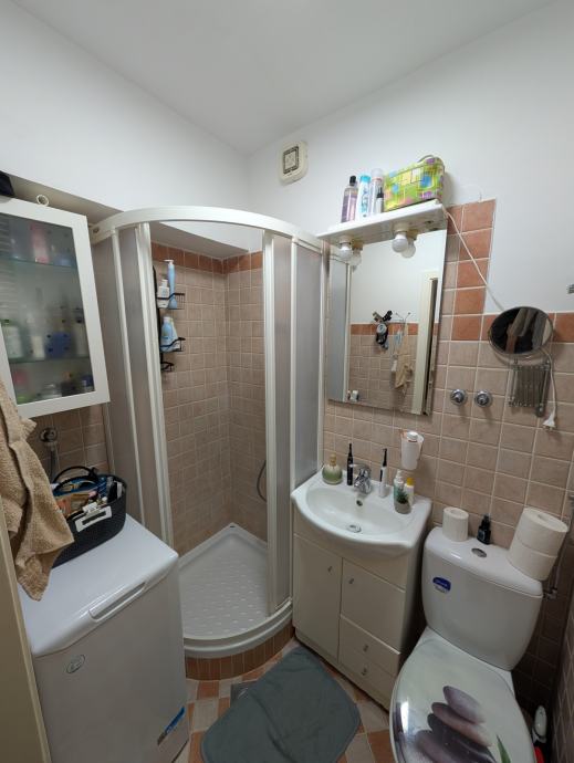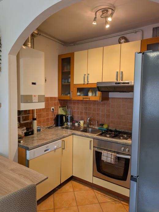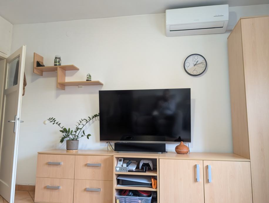 Stan se prodaje kompletno namješten s: bijelom tehnikom (vešmašina, perilica suđa, frižider, pećnica, štednjak, mikrovalna, klima, televizor) i namještajem