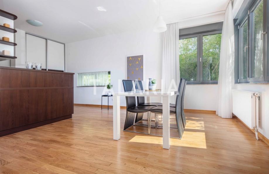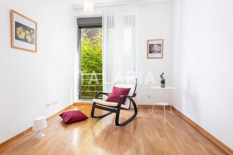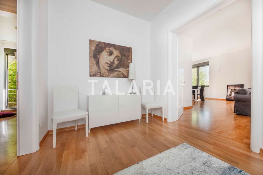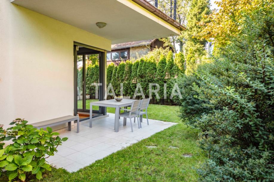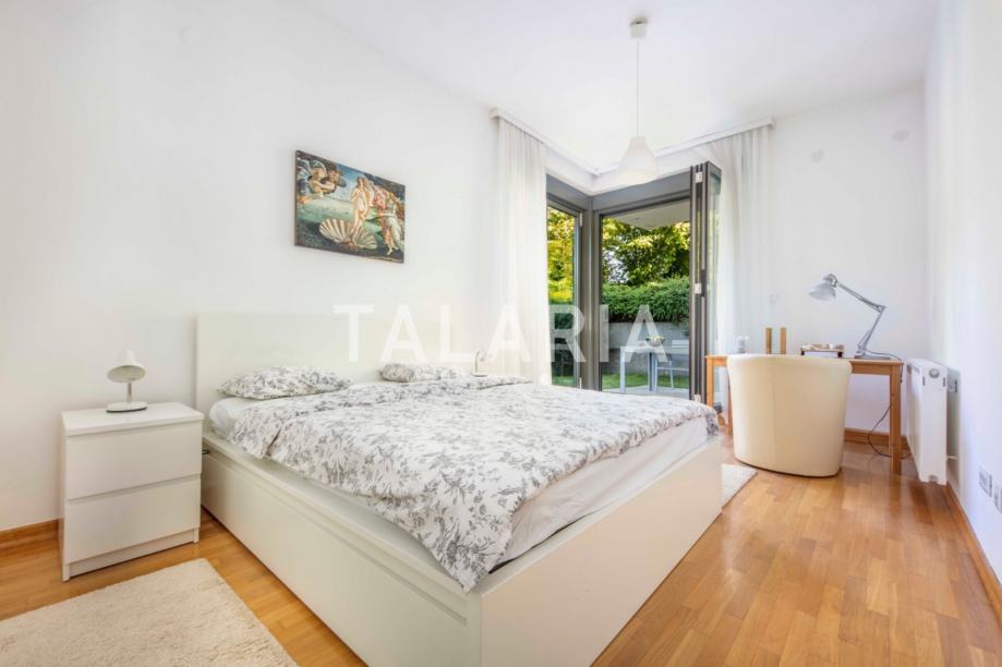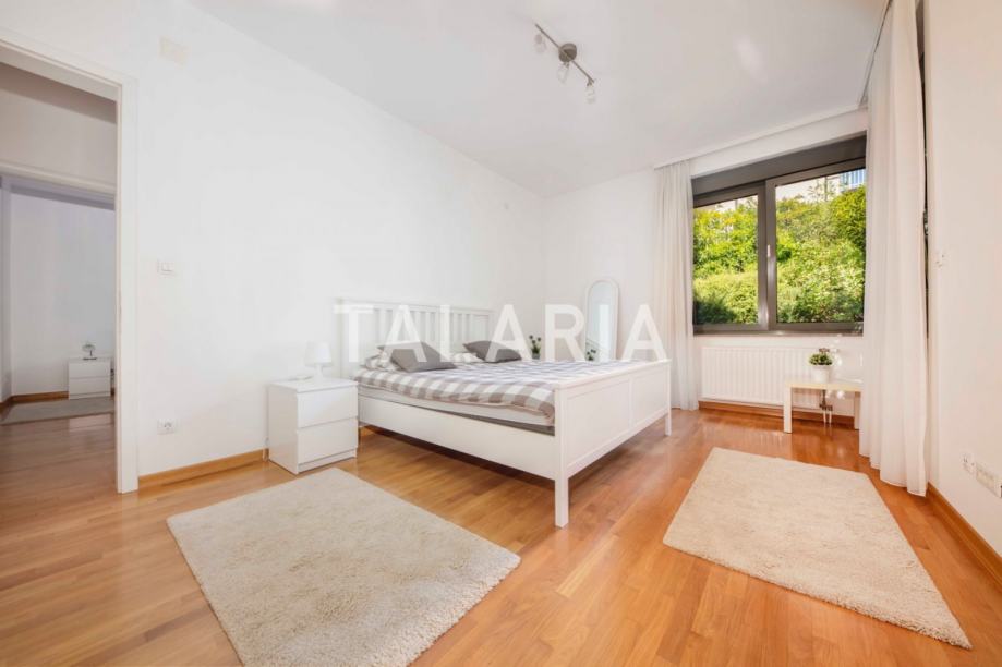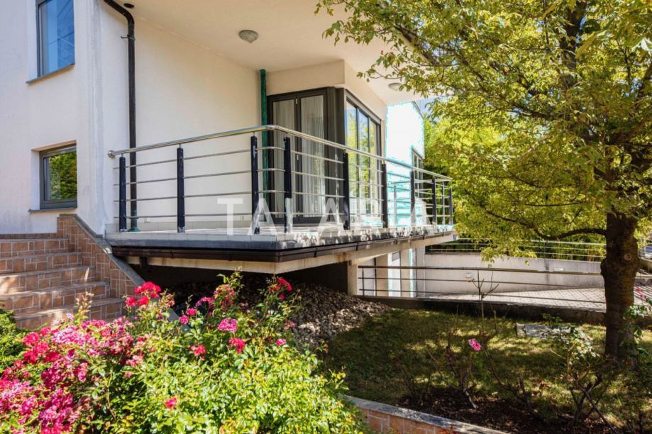 Very nice, modern, four room apartment of 165m2 on the ground floor in urban villa. It consists of entrance, 3 bedrooms, large living room with fireplace, kitchen, 2 bathrooms, 2 terraces and garden. Has a garage and basement. The building has an elevator.