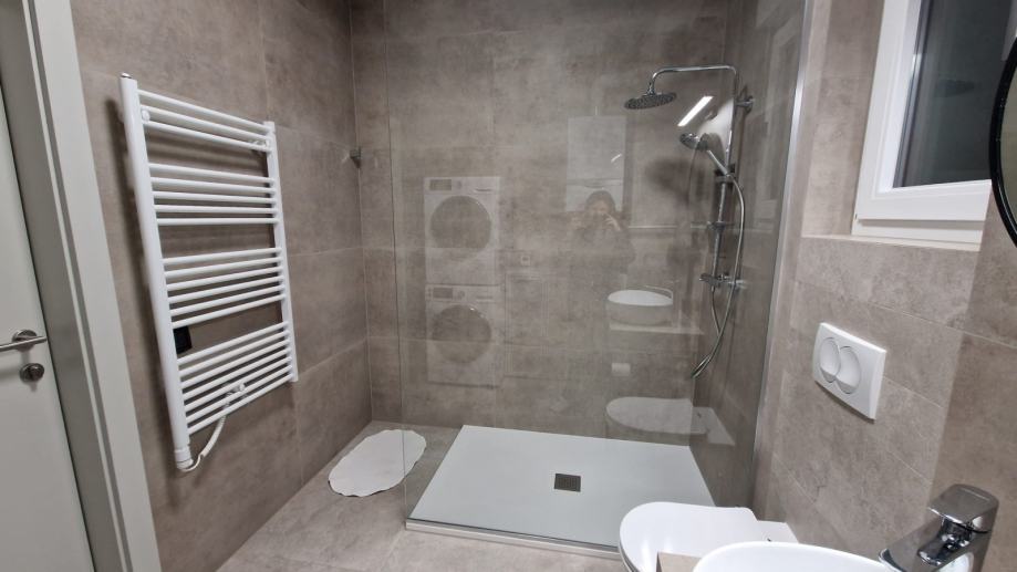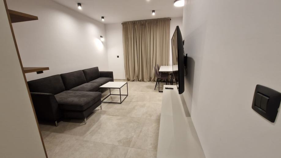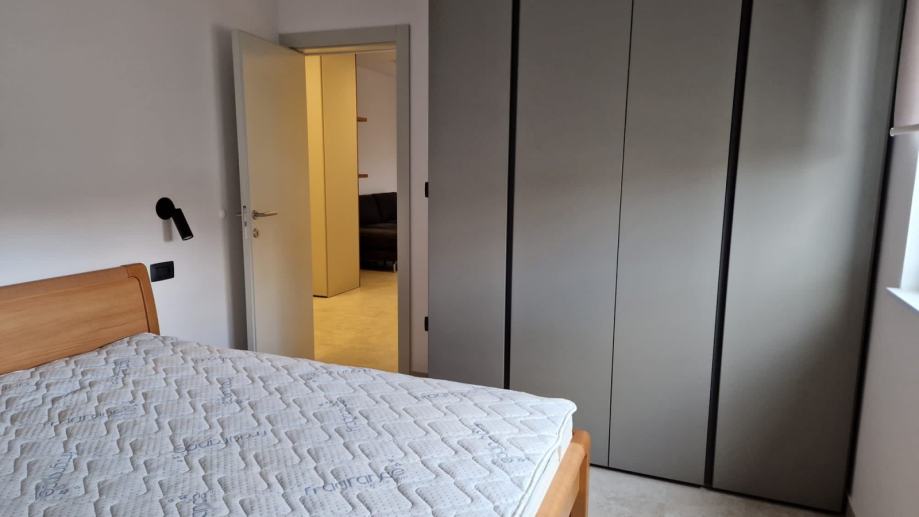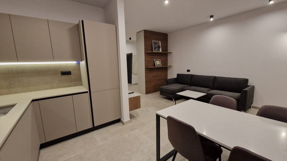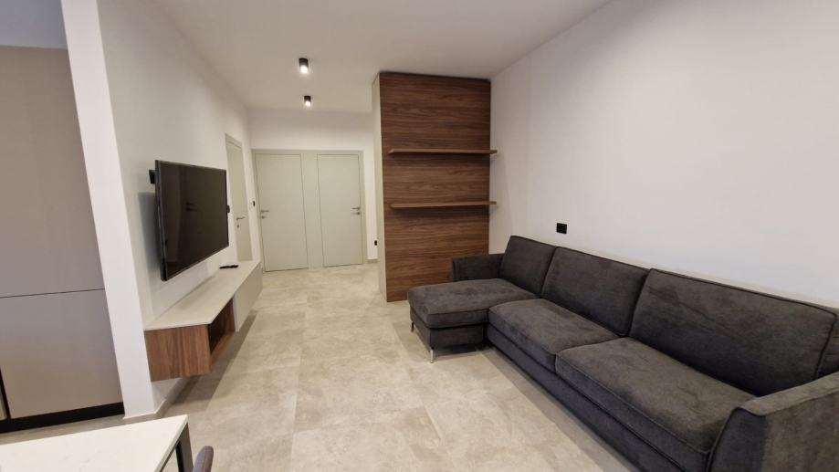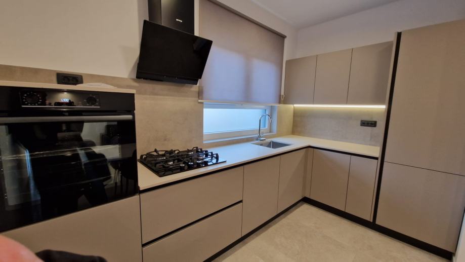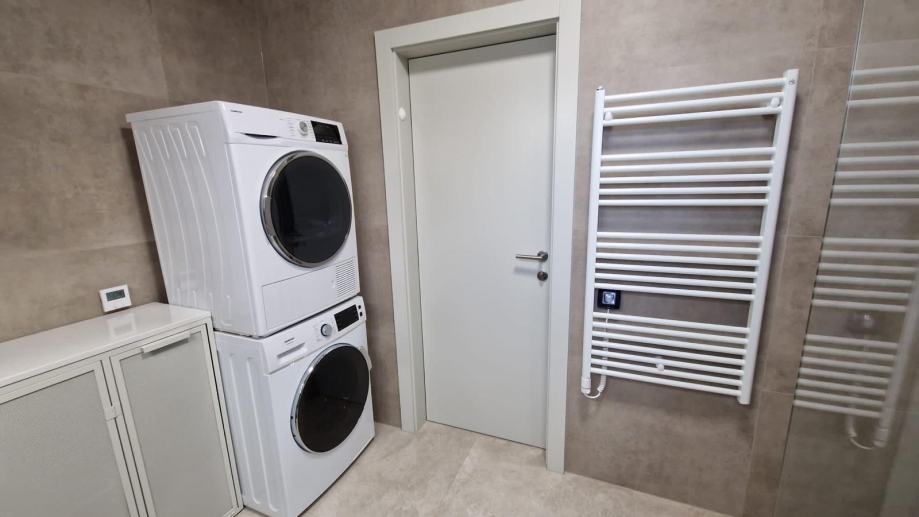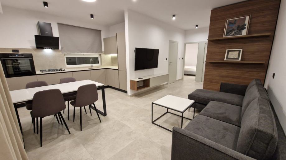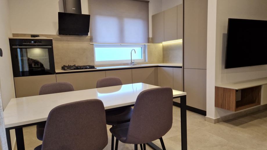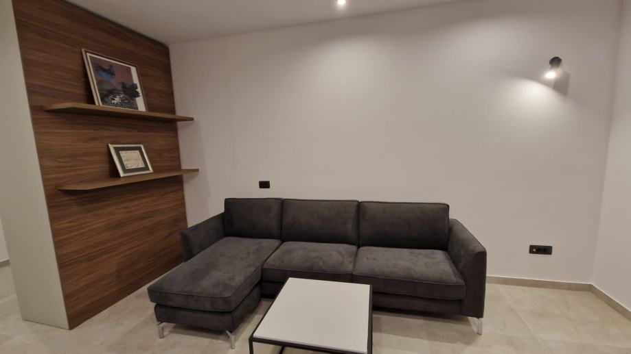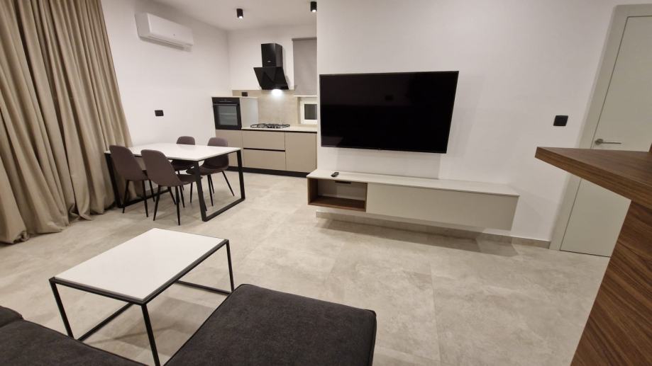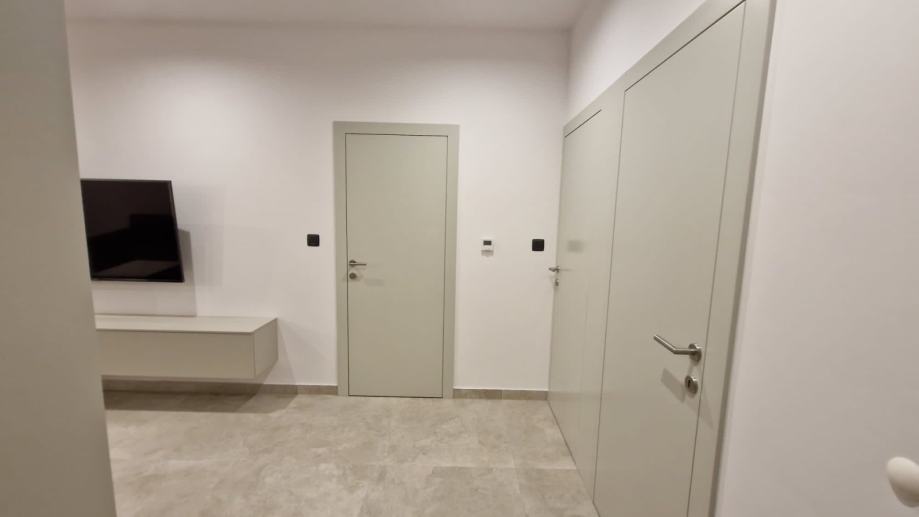 Opremljen je luksuznim talijanskim namještajem, Forma cuccine kuhinja, klima uređaj, podno grijanje, TV 55", perilica suđa i rublja, sušilica, video portafon i moderna mediapan unutarnja vrata s magnetskim bravama. Stanu pripadaju 2 parkirna mjesta na vlastitom privatnom parkingu koji ima direktan izlaz na glavnu cestu.