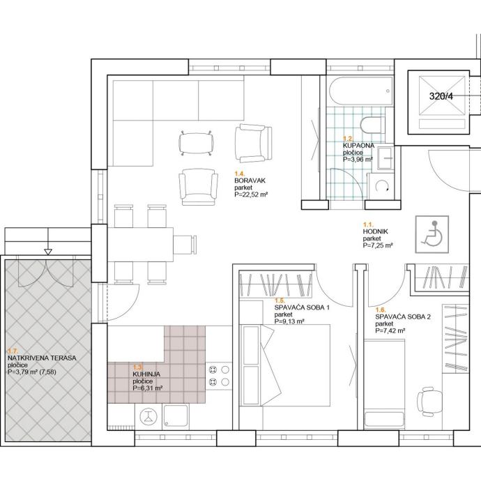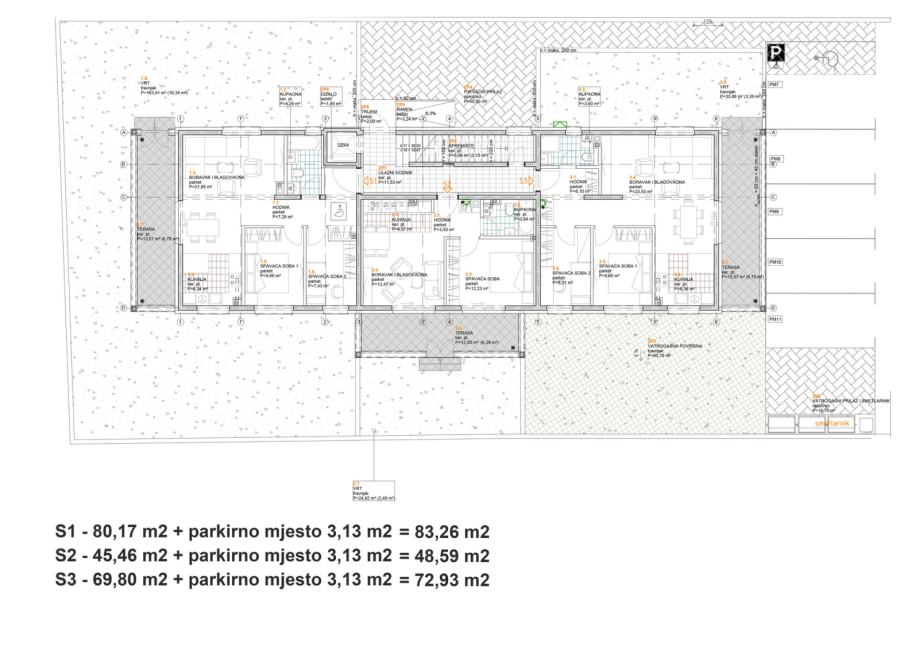 Stambena površina 56,79 m2 + natkrivena terasa 6,79 m2 + vrt 16,34 m2 + parkirno mjesto 3,13 m2.
