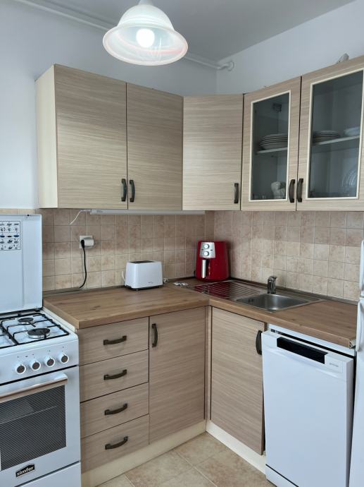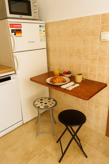 Kuhinja je opremljena novim štednjakom i perilicom posuđa, a tu je i mikrovalna pećnica te praktična friteza na vrući zrak (airfryer) za brze obroke i kuhalo za vodu.