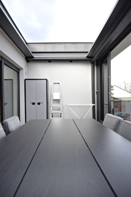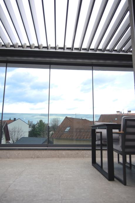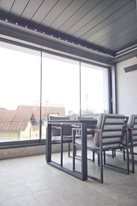 Stan se sastoji od kuhinje s blagavonicom i dnevnim boravkom, kupaonice i jedne spavace sobe, neto povrsine 48m2. Stan ima i 2 terase, manju od 4,7m2 te vecu od 16,50m2. Veca terasa je zatvorena staklenim stijenama te pomicnom bioklimatskom pergolom.