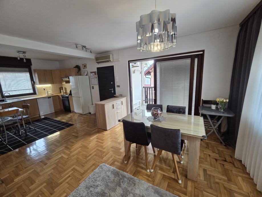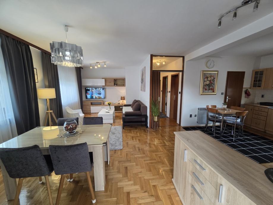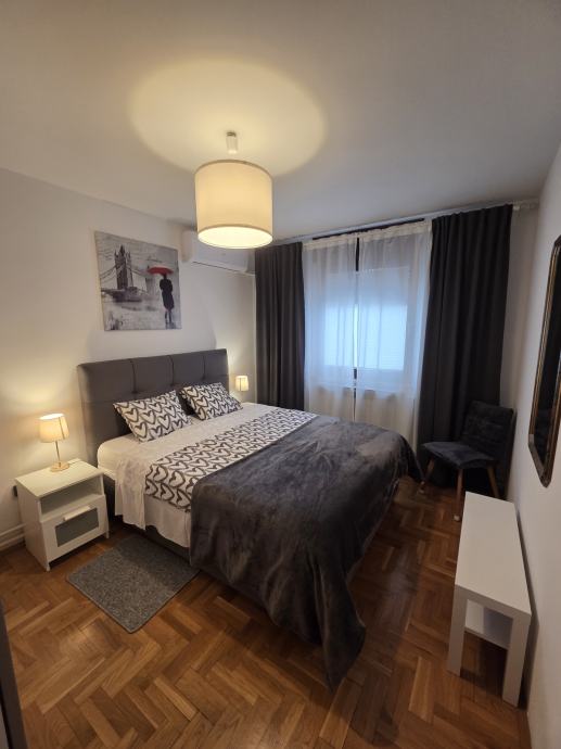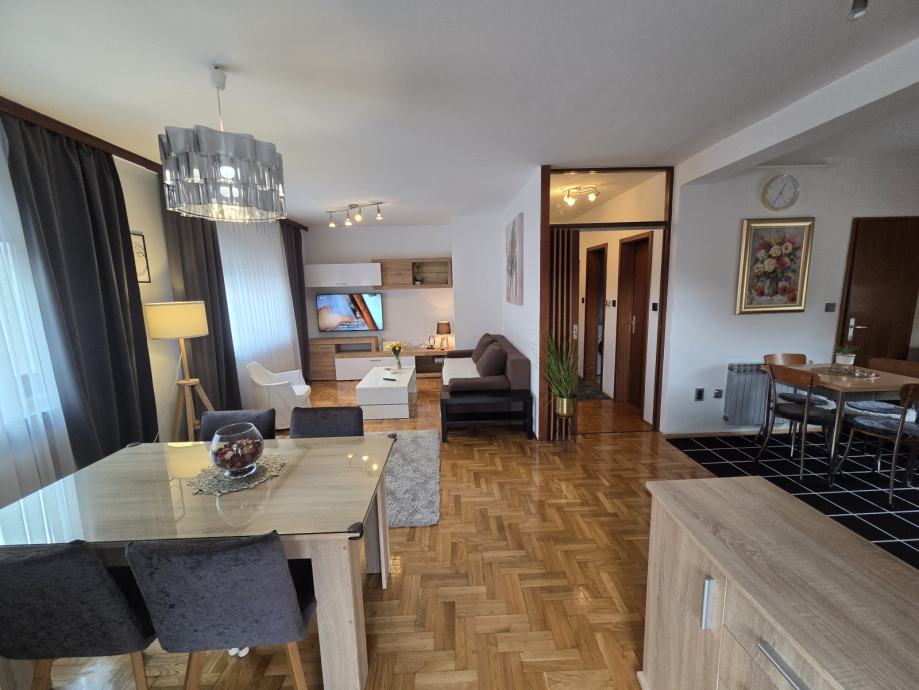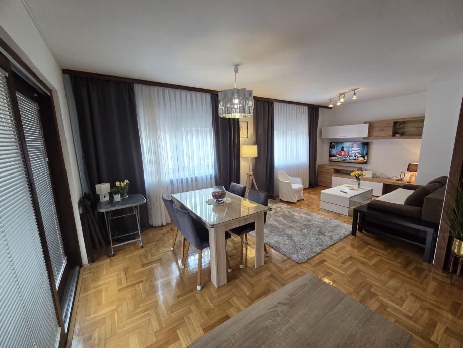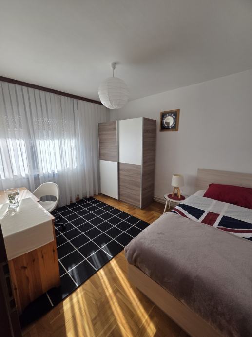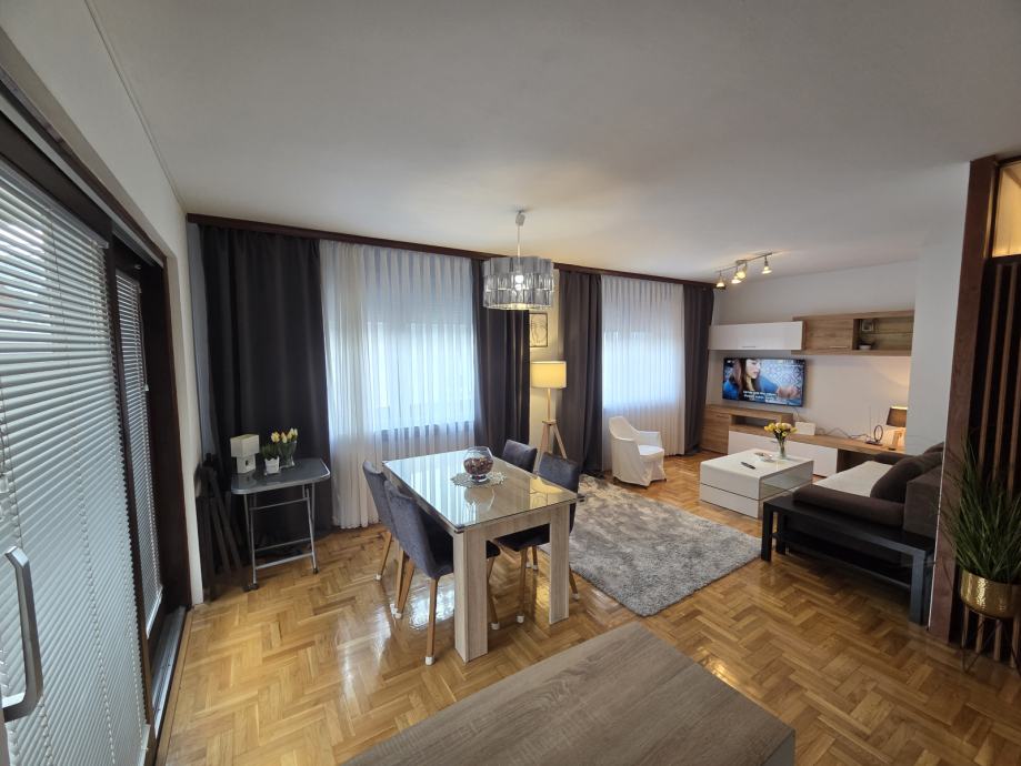Luksuzno opremljen i potpuno namješten stan 82 m2 iznajmljujem. Stan je orijentiran S-J-I i sastoji se od dnevnog boravka, blagovaonice, kuhinje sa izlazom na terasu, 2 spavaće sobe, hodnika, kupaonice sa WC - om i zasebnog WC-a te ostave. Opremljen je sa svim aparatima (štednjak, frižider, perilica rublja, suđerica, 2 klima uređaja, veliki novi smart TV... ) Nalazi se blizu Parka stara Trešnjevka, blizu Trešnjevačkog placa, tramvajske i autobusne stanice, u mirnoj i tihoj ulici, u blizini škole, ambulante, dućana . Stan je svijetao, prozračan i jako ugodan za život, mir i tišina susjedstva, male režije i u ulici besplatni parking. Iznajmljuje se na duže razdoblje sa ugovorom minimalno na godinu dana.