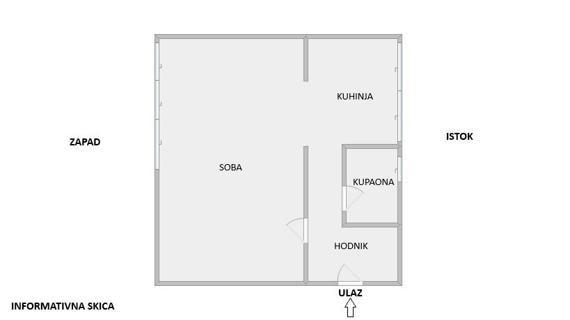 - Jednosoban: dnevni boravak/soba, hodnik, blagovaona i kuhinja.