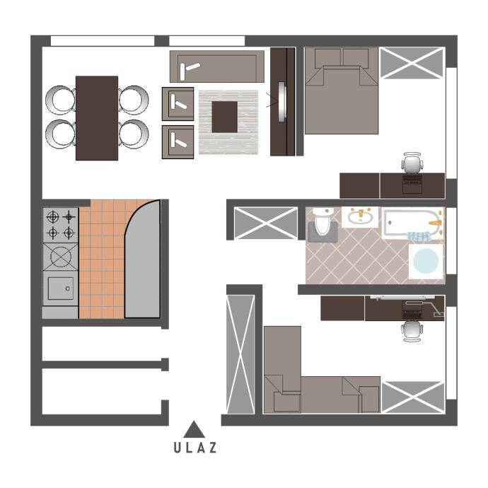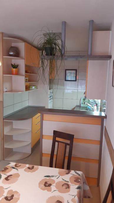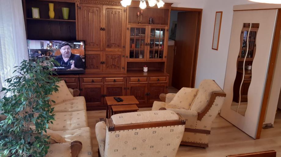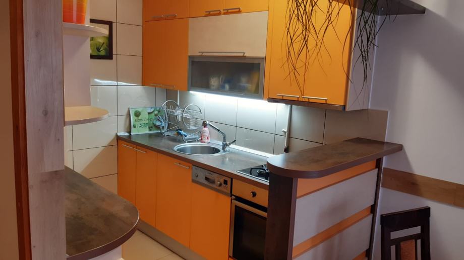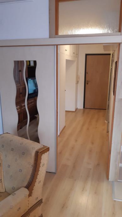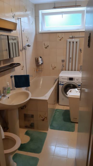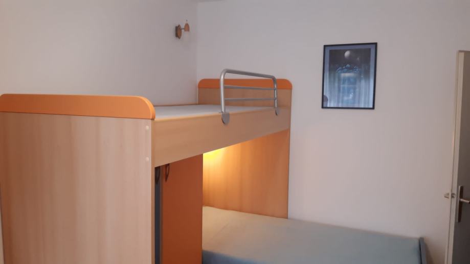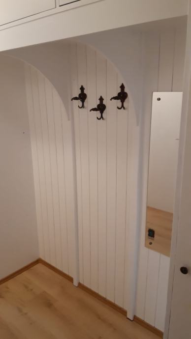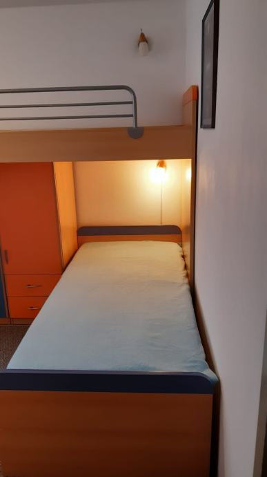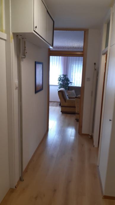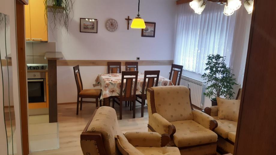Sastoji se od ulaznog hodnika s garderobom i ostavom, dnevnog boravaka i kuhinje s blagavaonicom, dvije spavaće sobe, kupaonice s WC-om. Potpuno je namješten. Ima klima uređaj, PVC stolariju, protuprovalna vrata, portafon.