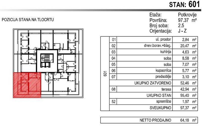Stan se nalazi na 6. katu (potkrovlje), ukupne površine 97.37m2