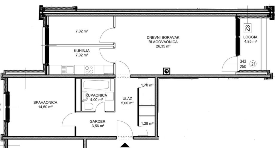 Stan se sastoji od: ulaznog hodnika, velikog dnevnog boravka i blagovaone s izlazom na loggiu, kuhinje, vešeraja, hodnika, jedne prostrane spavaće sobe s novim ugradbenim ormarom, druge manje spavaće/dječje sobe, kupaone, i spremišta u stanu.