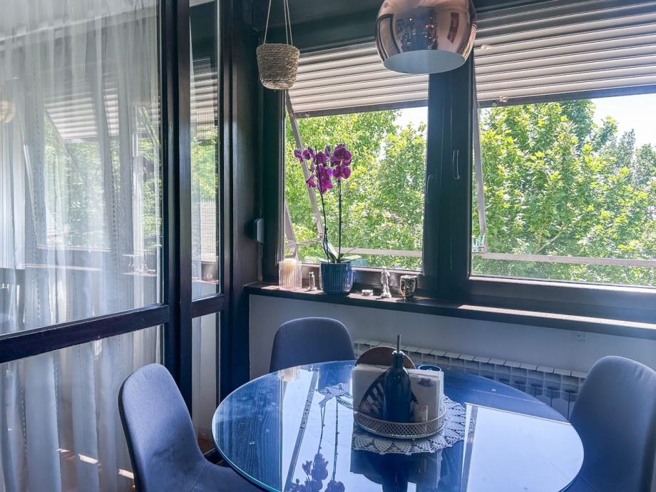 Nalazi se na 4.katu (zgrada nema lift) održavane zgrade, u mirnom dijelu naselja, pogled na park i krošnje drveća s jedne a na vrhove Medvednice s druge strane. Svi sadržaji su na udaljenosti od par minuta: dva vrtića, dvije osnovne škole, tržnica, supermarketi, trgovački centri, kino, park, sportski objekti, uskoro i bazen... Javni prijevoz lako dostupan, autobusna stanica na par metara od zgrade a tramvaj u Prečkom je udaljen cca 10min pješke.