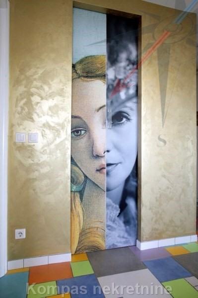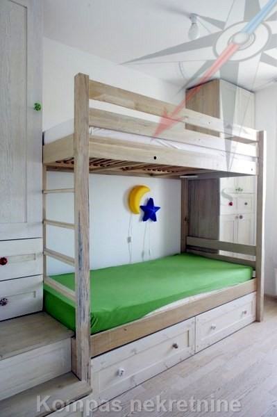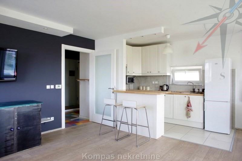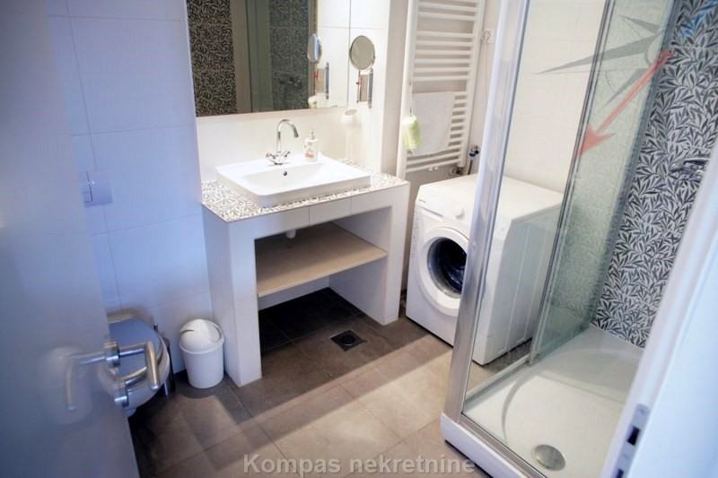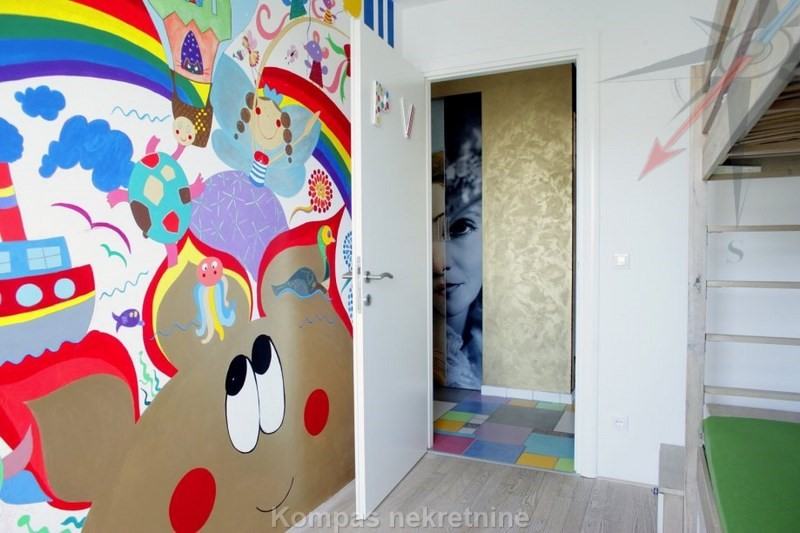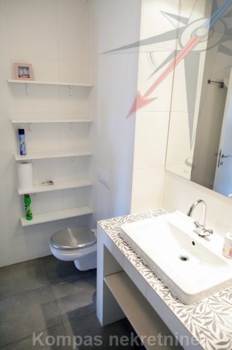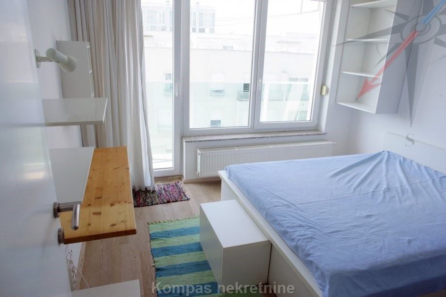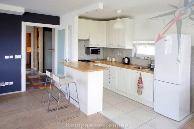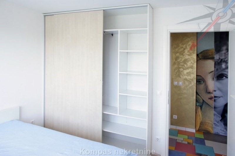 Modernly furnished 3-room apartment of 75 m2 on the fifth floor of a residential building with an elevator, Pavlenski put. It consists of an entrance hall, kitchen, living room, two bedrooms, a bathroom, a "walk-in" wardrobe. The bedrooms have a balcony of 7 m2, a living room the balcony of 9 m2 with awning and gas grill. The apartment has intercom, security door, a possibility of fast internet connection, cable TV, air conditioning, gas central heating, all appliances, linens, cutlery. Has a parking place in the underground garage. Located in a quiet street, close to school, kindergarten, several shopping centers and public transport.