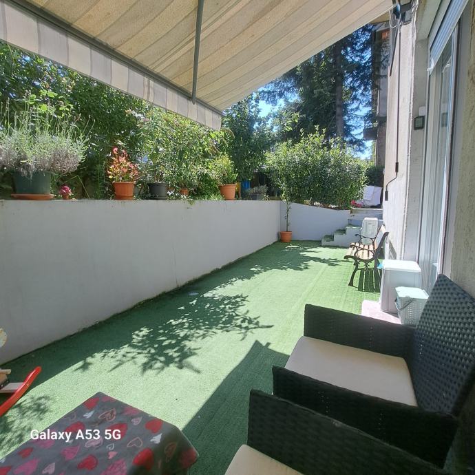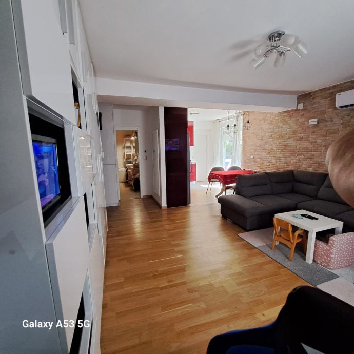 Stan se sastoji od ulaznog prostora, ˝open space˝ kuhinje, blagovaone i dnevnog boravka, spavaće sobe, kupaonice i terase/vrta. Potpuno je adaptiran i uređen 2021. godine, te se prodaje sa svim namještajem i aparatima.