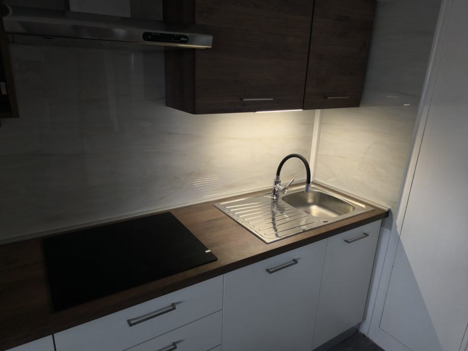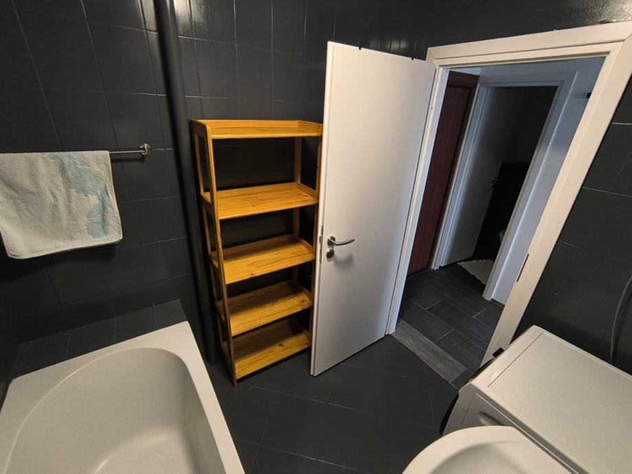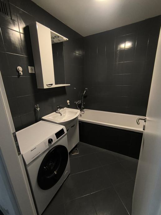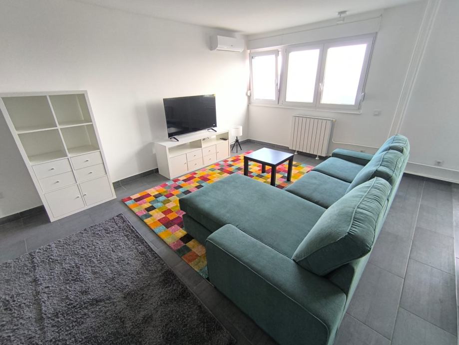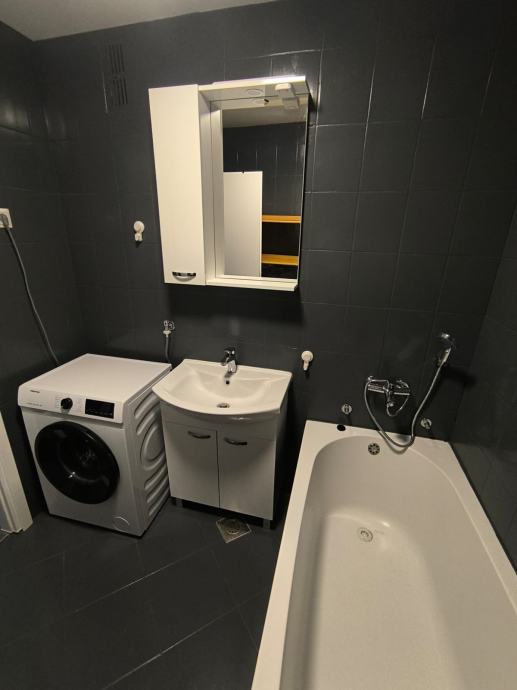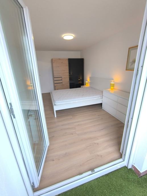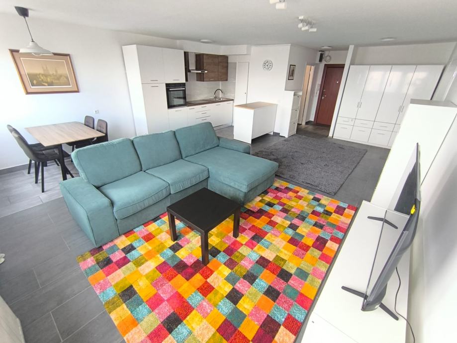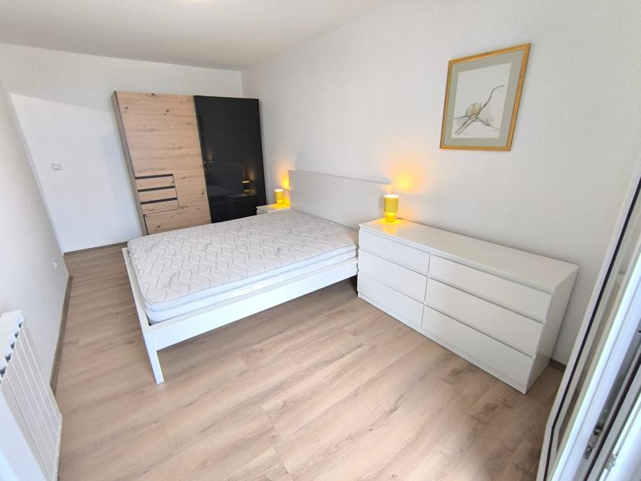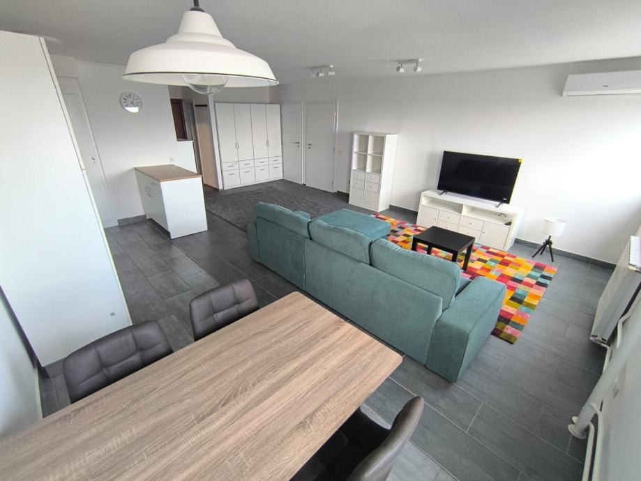Stan je friško uređen, opremljen novim namještajem, kuhinjom, bijelom tehnikom, klimom, sanitarijama i unutarnjom stolarijom.