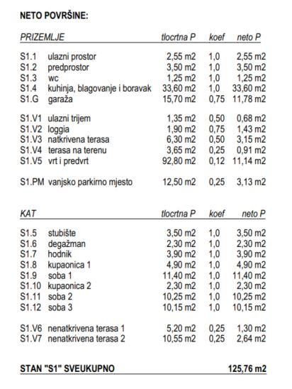 - prizemlje (Pr) garaža, ulazni prostor sa stubištem, dnevni boravak, blagovanje, kuhinja, wc