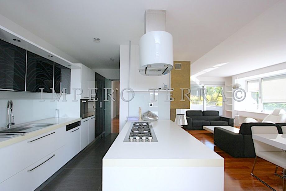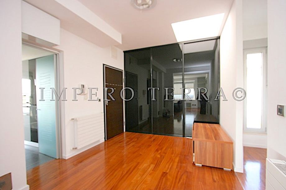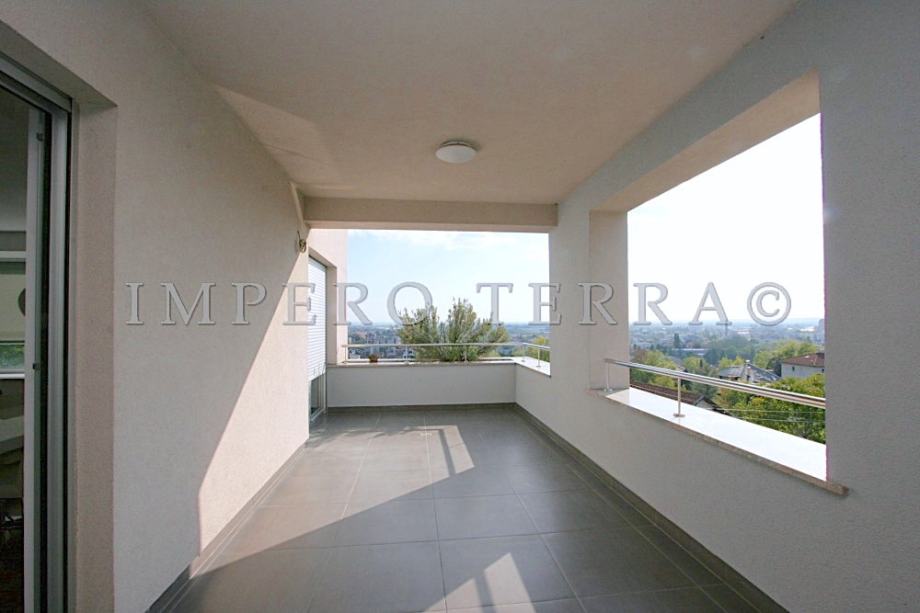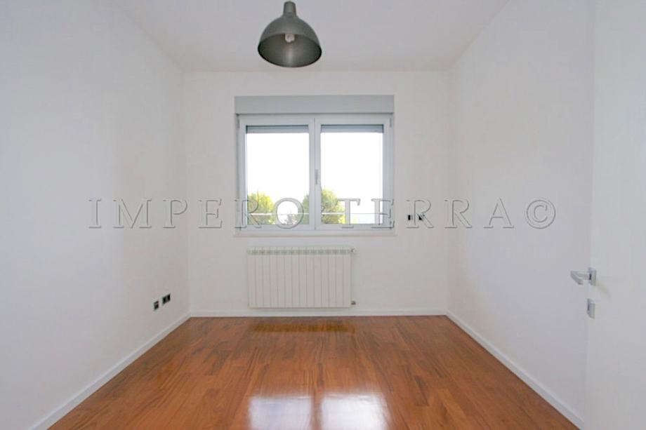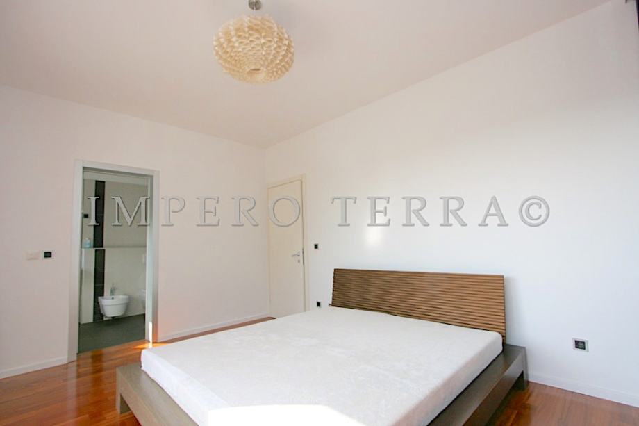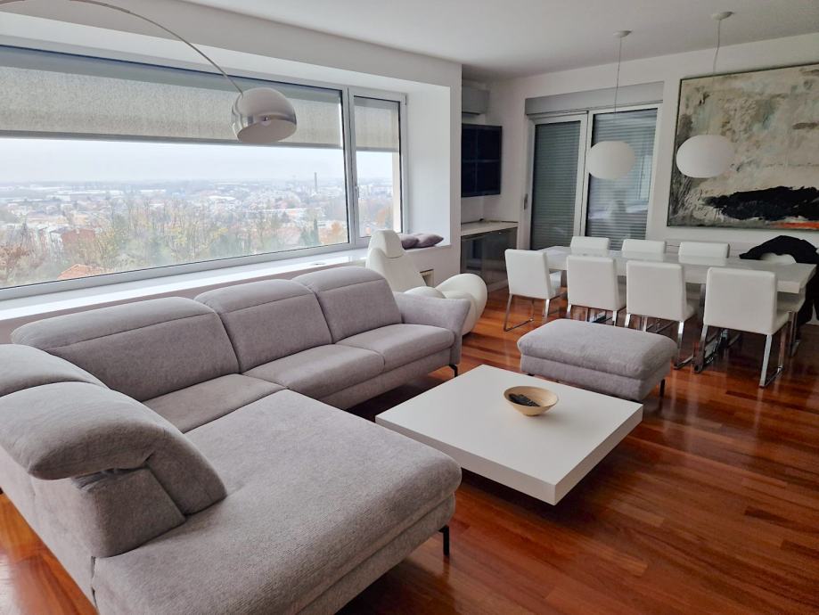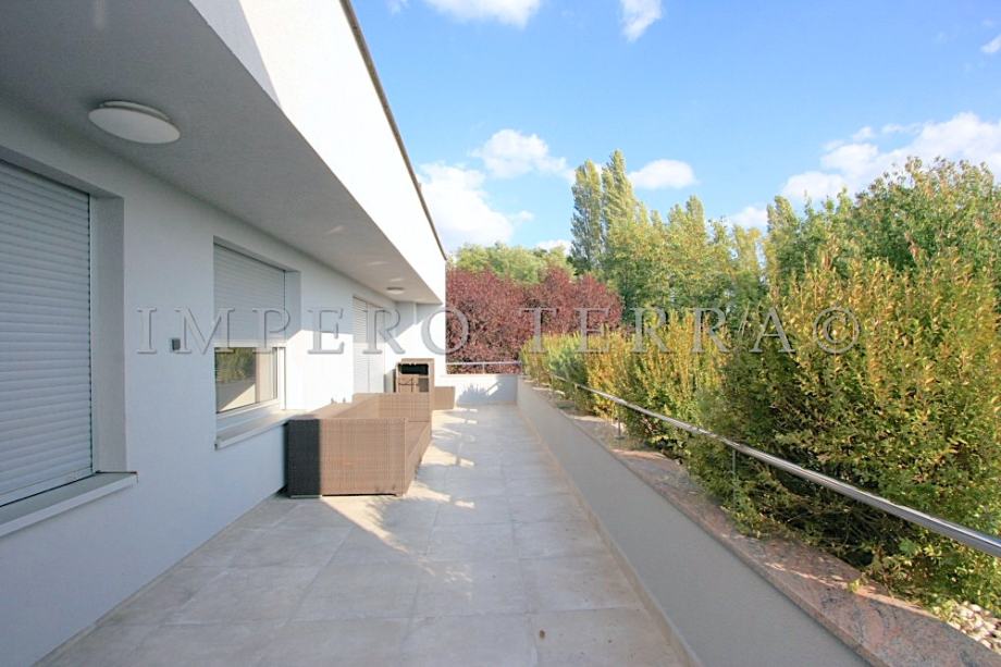 Luksuzno uređen i opremljen četverosoban stan površine 141 m2 na 1. katu urbane vile koja ima samo tri stana. Stan se sastoji od velikog dnevnog boravka s kaminom i pogledom na zapadni dio grada koji je povezan s terasom od 41m2, blagovanja, kompletno opremljene kuhinje sa svim kućanskim aparatima koja izlazi na lođu 15 m2, odvojene tri sobe od kojih jedna s garderobom, jedna s kupaonicom i dječje sobe, druge gostinjske kupaonice, gostinjskog wc-a, parkirno mjesto od 11,00 m2. Stanu pripada i garaža.