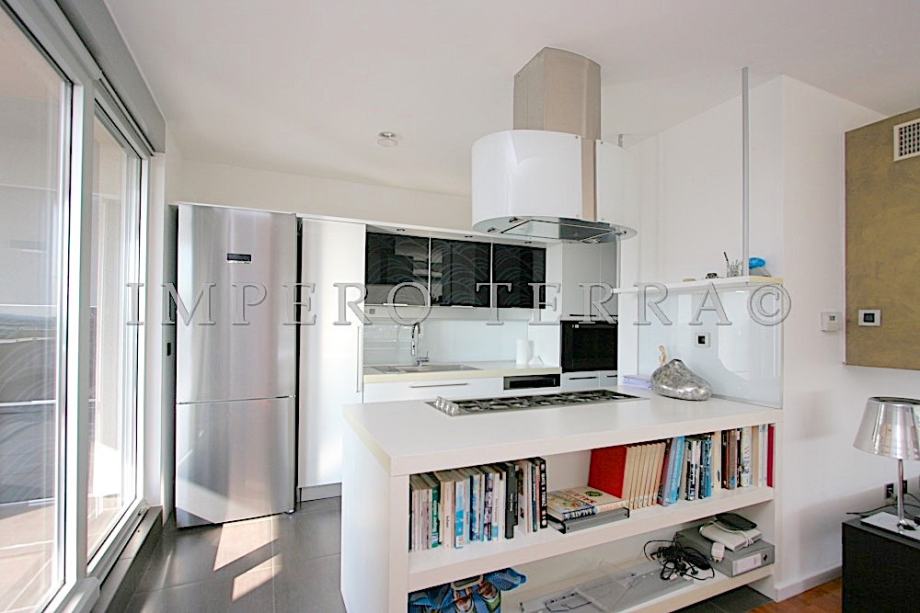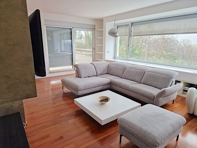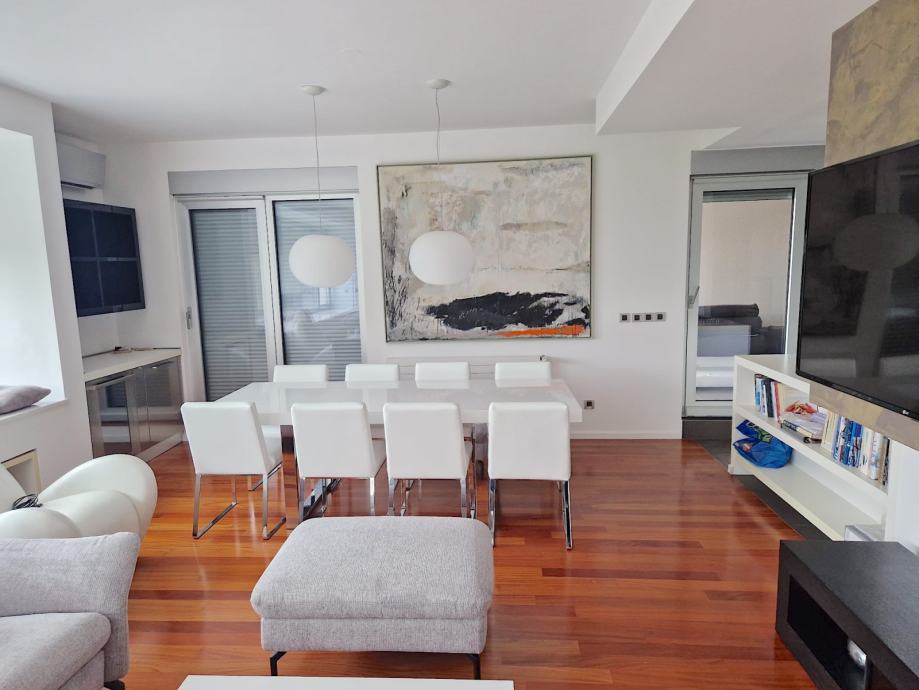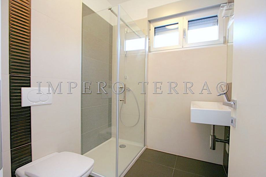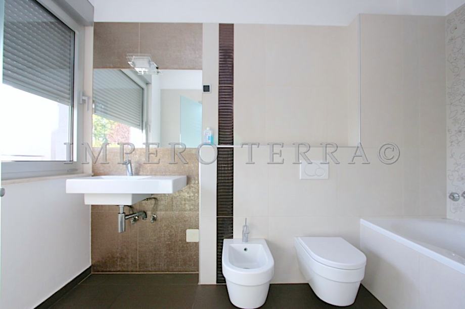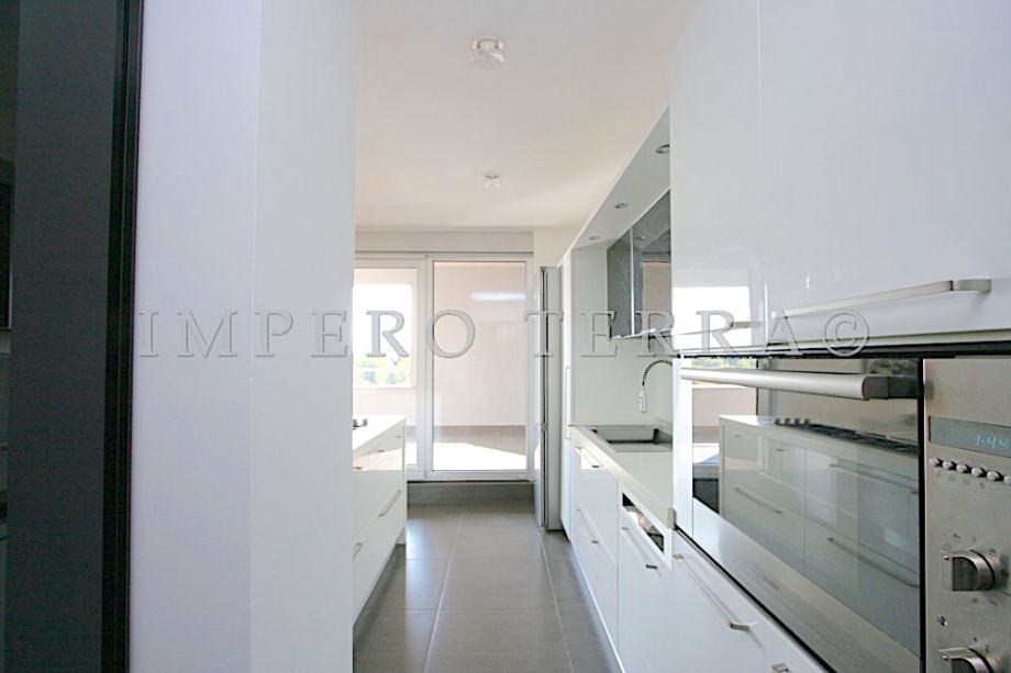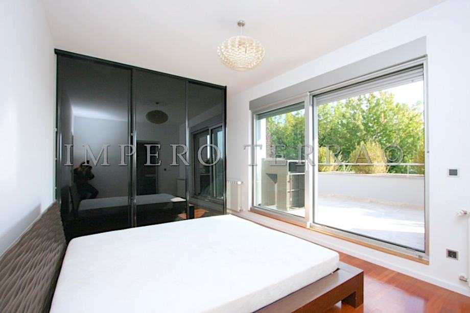 Luksuzno uređen i opremljen četverosoban stan površine 141 m2 na 1. katu urbane vile koja ima samo tri stana. Stan se sastoji od velikog dnevnog boravka s kaminom i pogledom na zapadni dio grada koji je povezan s terasom od 41m2, blagovanja, kompletno opremljene kuhinje sa svim kućanskim aparatima koja izlazi na lođu 15 m2, odvojene tri sobe od kojih jedna s garderobom, jedna s kupaonicom i dječje sobe, druge gostinjske kupaonice, gostinjskog wc-a, parkirno mjesto od 11,00 m2. Stanu pripada i garaža.