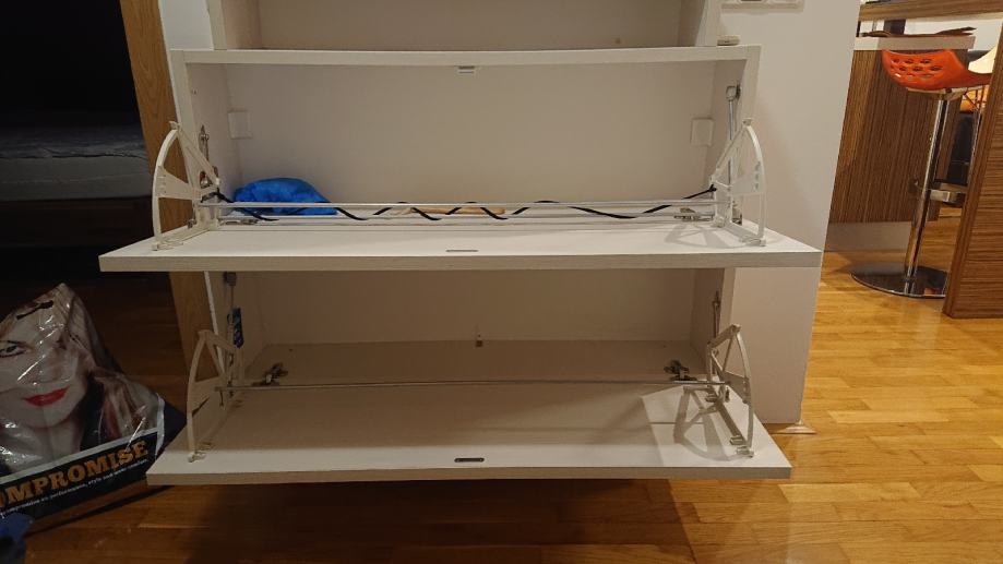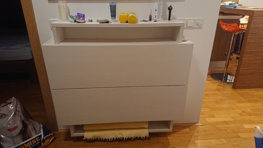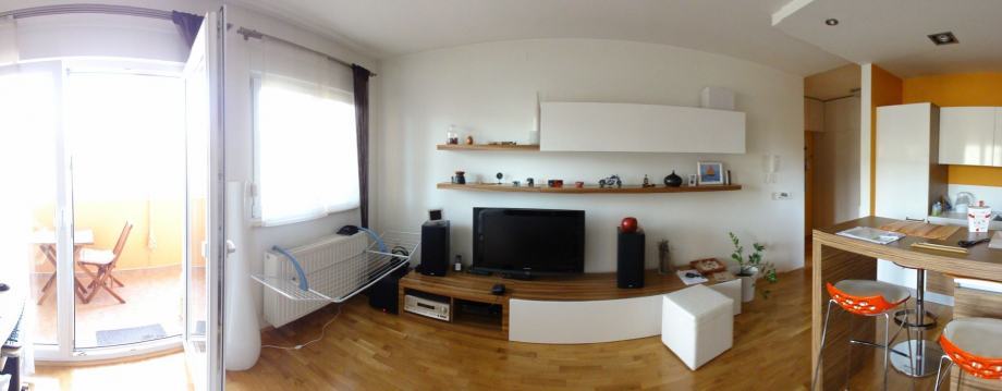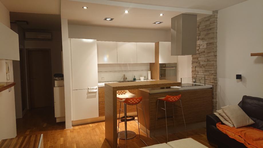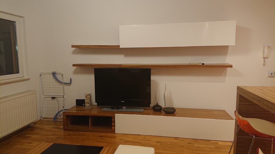 Stan je kompletno namješten: spavaća soba (bračni krevet, komoda, noćni ormarići, garderobni ormar od 3m), kuhinja po mjeri s ugradbenom tehnikom (Electrolux, Candy, Faber, Bosch), kvalitetni namještaj i vrtna garnitura na balkonu.