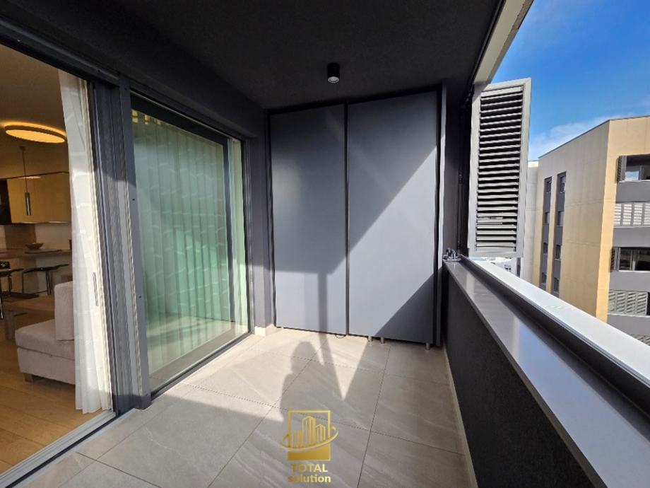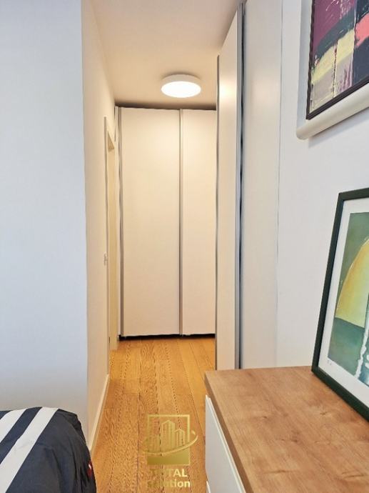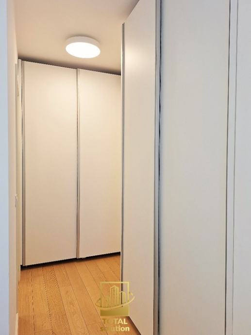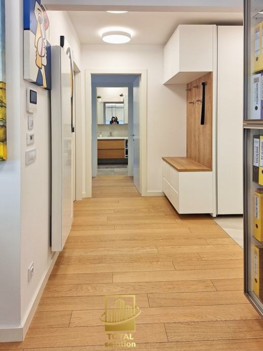 Sastoji od sljedećeg: hodnik sa ugradbenim ormarima, predsoblje l, kupaona (l), elegantni open-space dnevni boravak sa kuhinjom i blagavaonom te izlazom na loggiu, loggia (8,43 m2), spavaća soba (l), spavaća soba (ll) sa vlastitim predsobljem i kupaonom (ll). Visina stropa u svim prostorijama iznosi 2,80 m. Kopaone i hodnici imaju razvedeno podno grijanje, dok su u ostalim prostorijama radijatori, sve upravljano SMART-HOME sustavom.
