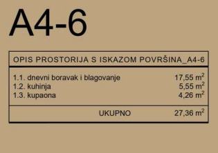 Stan A4-6 se nalazi se u zgradi A. Sastoji se od dnevnog boravka i blagavaonice (17,55 m2), kuhinje (5,55 m2), kupaone (4,26 m2).