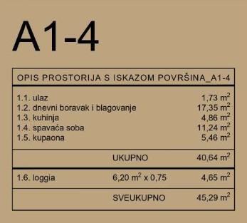 Stan A1-4 se nalazi se u zgradi A. Sastoji se od ulaza (1,73 m2), dnevnog boravka i blagavaonice (17,35 m2), kuhinje (4,86 m2), kupaona (5,46 m2), jedne spavaće sobe (11,24 m2) i loggie (6,20 m2 - po obračunskom koeficijentu 4,65 m2).